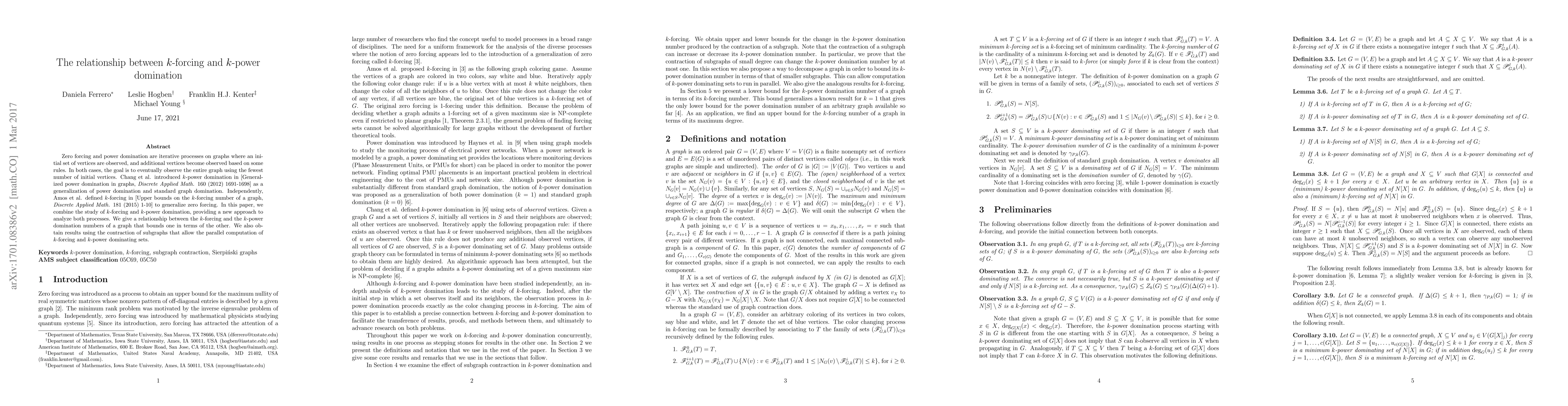 This paper explores the relationship between $k$-forcing and $k$-power domination in graphs, providing a new analytical approach to both processes. It establishes a bound relating the $k$-forcing number to the $k$-power domination number and utilizes subgraph contractions for parallel computation of dominating sets.