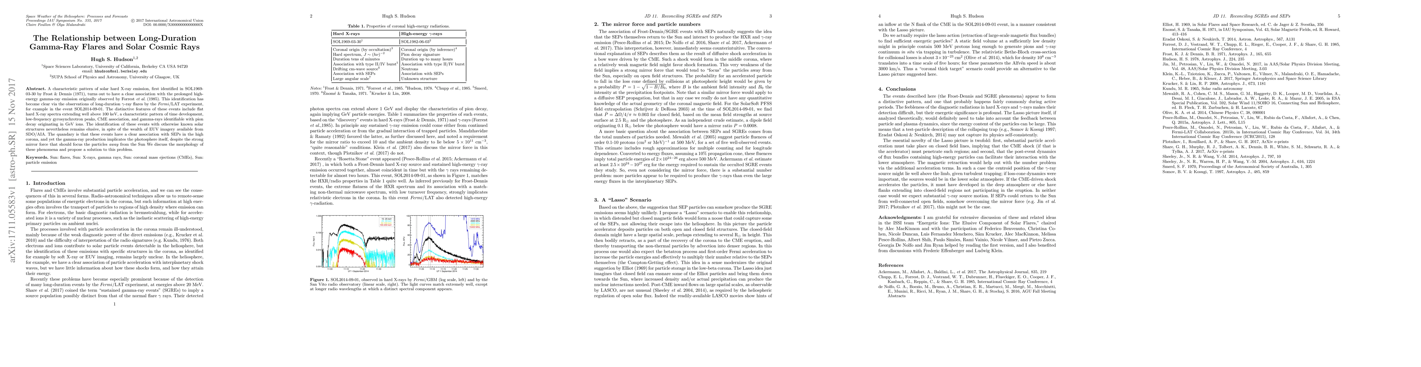 This paper investigates the correlation between long-duration gamma-ray flares and solar cosmic rays, identifying a pattern of hard X-ray emission linked to high-energy gamma-ray events. Despite their association with solar energetic particles, the exact solar structures generating these phenomena remain unidentified.
