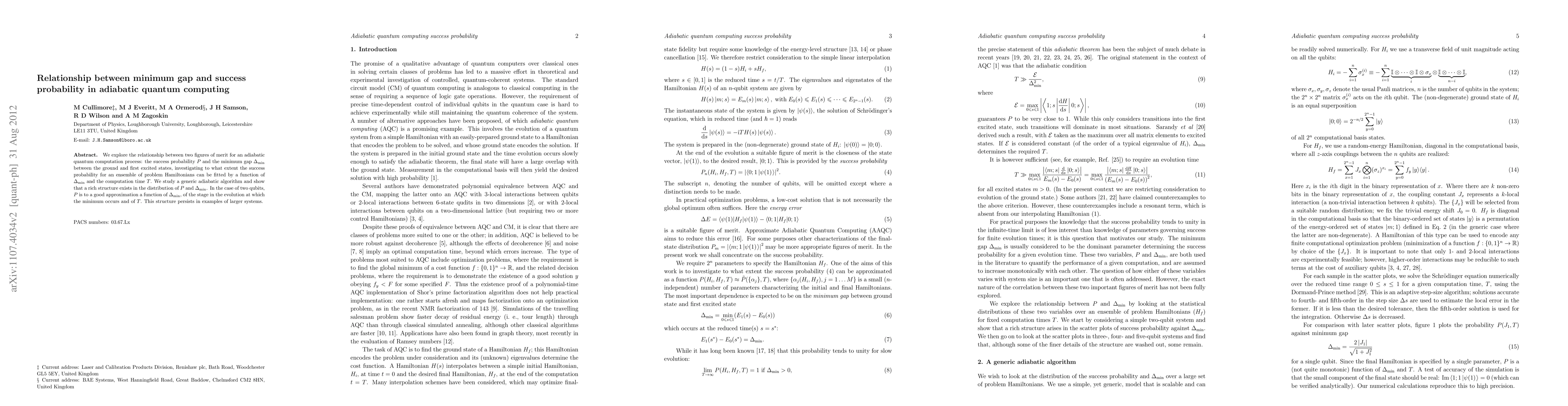 This paper investigates the relationship between success probability $P$ and minimum gap $\Delta_{min}$ in adiabatic quantum computing, demonstrating that $P$ can be approximated as a function of $\Delta_{min}$, the evolution stage, and computation time $T$, particularly for two-qubit systems. The study reveals a complex structure in the distribution of $P$ and $\Delta_{min}$ across various problem Hamiltonians.
