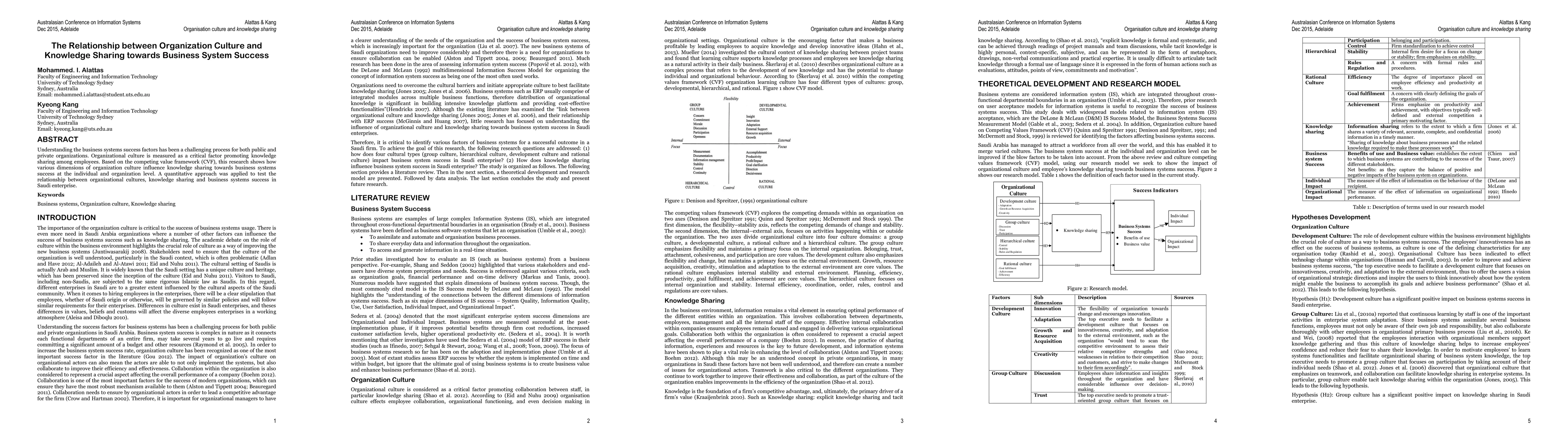 This research investigates the impact of organizational culture on knowledge sharing and its subsequent effect on business systems success, using a quantitative approach in Saudi enterprises. It demonstrates how various dimensions of organizational culture, as defined by the competing value framework, influence knowledge sharing at both individual and organizational levels.