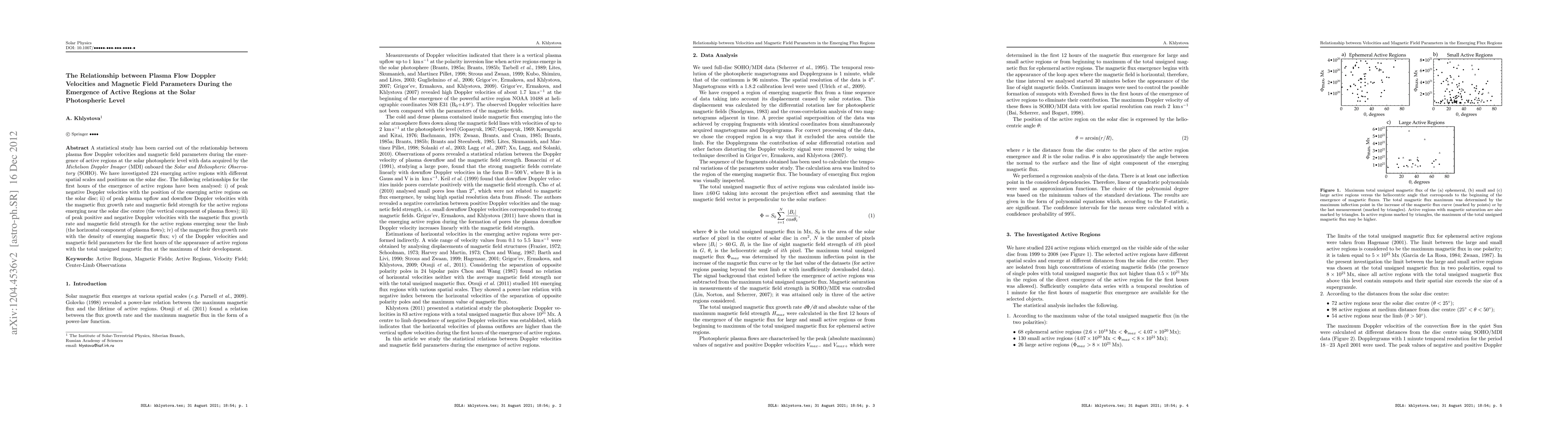 This study statistically analyzes the relationship between plasma flow Doppler velocities and magnetic field parameters during the emergence of 224 active regions on the solar photosphere, revealing correlations between Doppler velocities and magnetic flux growth rates, field strengths, and positions, particularly for regions near the solar disc center and limb.