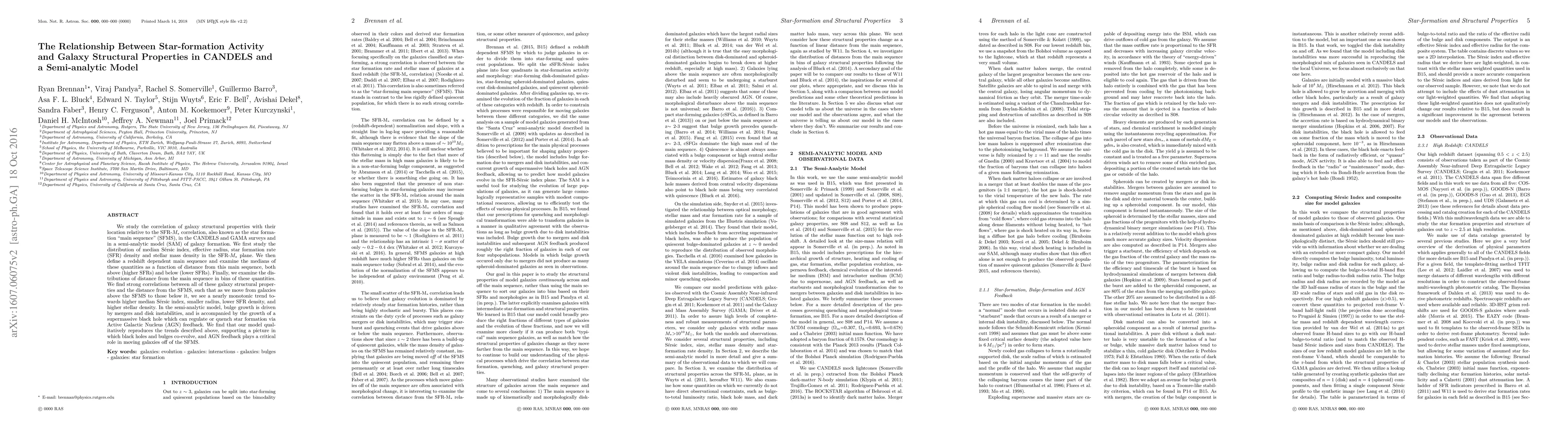 This paper investigates the relationship between galaxy structural properties and their star formation activity, using data from CANDELS and GAMA surveys and a semi-analytic model. It finds strong correlations between structural properties and distance from the star formation "main sequence," with galaxies above the main sequence showing different structural trends than those below. The semi-analytic model supports these findings, suggesting AGN feedback regulates star formation and drives co-evolution of black holes and galaxy bulges.