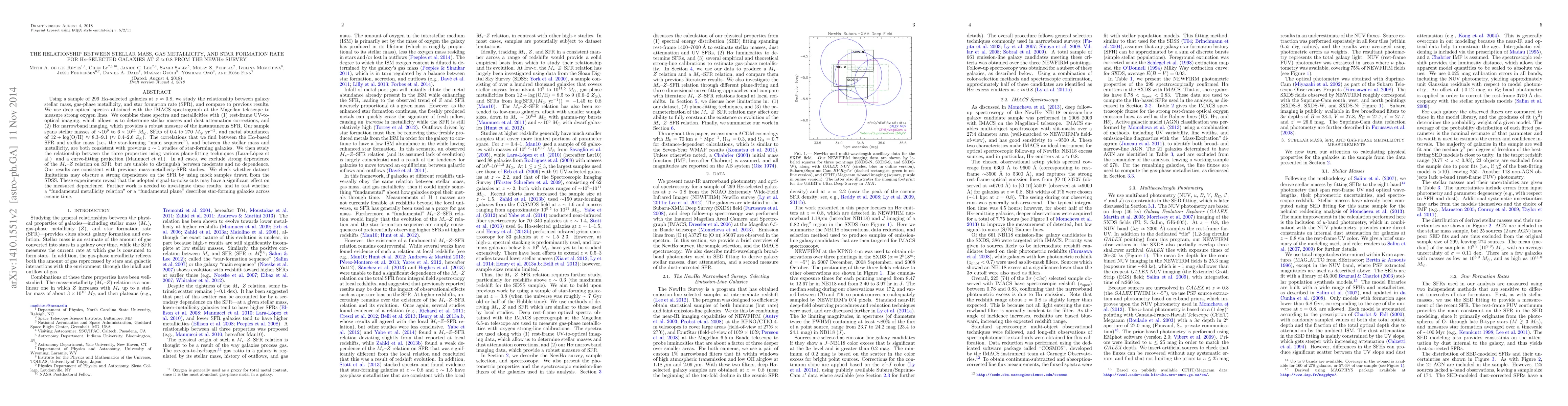Using a sample of 299 Ha-selected galaxies at z~0.8, we study the relationship between galaxy stellar mass, gas-phase metallicity, and star formation rate (SFR), and compare to previous results. We use deep optical spectra obtained with the IMACS spectrograph at the Magellan telescope to measure strong oxygen lines. We combine these spectra and metallicities with (1) rest-frame UV-to-optical imaging, which allows us to determine stellar masses and dust attenuation corrections, and (2) Ha narrowband imaging, which provides a robust measure of the instantaneous SFR. Our sample spans stellar masses of 10^9 to 6*10^11 solar masses, SFRs of 0.4 to 270 solar masses per year, and metal abundances of 12+log(O/H)~8.3-9.1 (~0.4-2.6 solar metallicity). The correlations that we find between the Ha-based SFR and stellar mass (i.e., the star-forming "main sequence"), and between the stellar mass and metallicity, are both consistent with previous z~1 studies of star-forming galaxies. We then study the relationship between the three properties using various plane-fitting techniques (Lara-Lopez et al.) and a curve-fitting projection (Mannucci et al.). In all cases, we exclude strong dependence of the M-Z relation on SFR, but are unable to distinguish between moderate and no dependence. Our results are consistent with previous mass-metallicity-SFR studies. We check whether dataset limitations may obscure a strong dependence on the SFR by using mock samples drawn from the SDSS. These experiments reveal that the adopted signal-to-noise cuts may have a significant effect on the measured dependence. Further work is needed to investigate these results, and to test whether a "fundamental metallicity relation" or a "fundamental plane" describes star-forming galaxies across cosmic time.