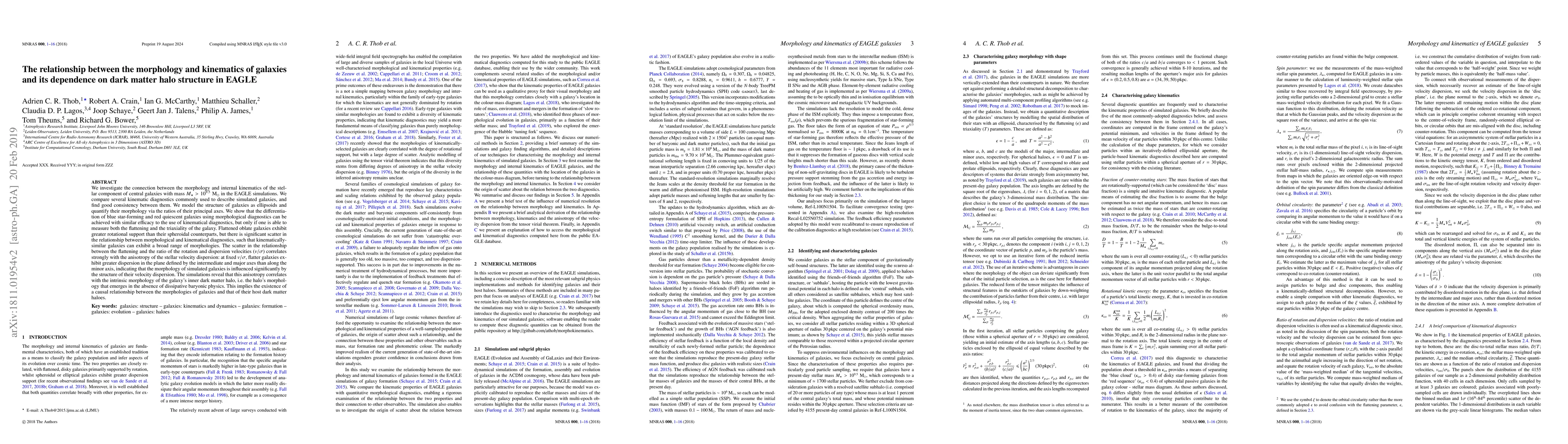 We investigate the connection between the morphology and internal kinematics of the stellar component of central galaxies with mass $M_\star > {10}^{9.5} {\rm M}_\odot$ in the EAGLE simulations. We compare several kinematic diagnostics commonly used to describe simulated galaxies, and find good consistency between them. We model the structure of galaxies as ellipsoids and quantify their morphology via the ratios of their principal axes. We show that the differentiation of blue star-forming and red quiescent galaxies using morphological diagnostics can be achieved with similar efficacy to the use of kinematical diagnostics, but only if one is able to measure both the flattening and the triaxiality of the galaxy. Flattened oblate galaxies exhibit greater rotational support than their spheroidal counterparts, but there is significant scatter in the relationship between morphological and kinematical diagnostics, such that kinematically-similar galaxies can exhibit a broad range of morphologies. The scatter in the relationship between the flattening and the ratio of the rotation and dispersion velocities ($v/\sigma$) correlates strongly with the anisotropy of the stellar velocity dispersion: at fixed $v/\sigma$, flatter galaxies exhibit greater dispersion in the plane defined by the intermediate and major axes than along the minor axis, indicating that the morphology of simulated galaxies is influenced significantly by the structure of their velocity dispersion. The simulations reveal that this anisotropy correlates with the intrinsic morphology of the galaxy's inner dark matter halo, i.e. the halo's morphology that emerges in the absence of dissipative baryonic physics. This implies the existence of a causal relationship between the morphologies of galaxies and that of their host dark matter haloes.