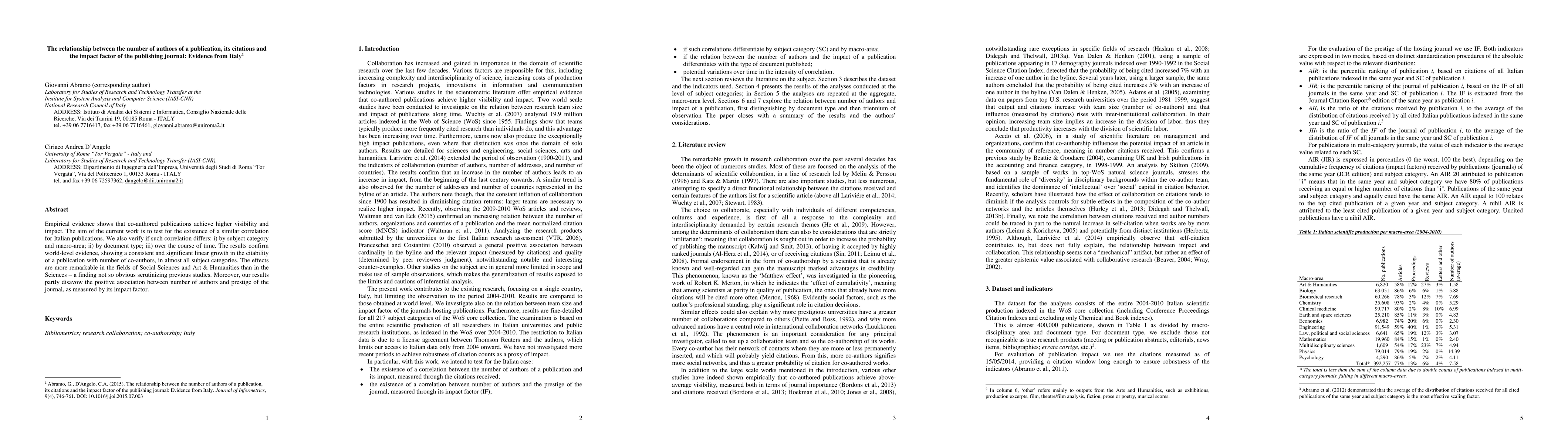 Empirical evidence shows that co-authored publications achieve higher visibility and impact. The aim of the current work is to test for the existence of a similar correlation for Italian publications. We also verify if such correlation differs: i) by subject category and macro-area; ii) by document type; iii) over the course of time. The results confirm world-level evidence, showing a consistent and significant linear growth in the citability of a publication with number of co-authors, in almost all subject categories. The effects are more remarkable in the fields of Social Sciences and Art & Humanities than in the Sciences-a finding not so obvious scrutinizing previous studies. Moreover, our results partly disavow the positive association between number of authors and prestige of the journal, as measured by its impact factor.