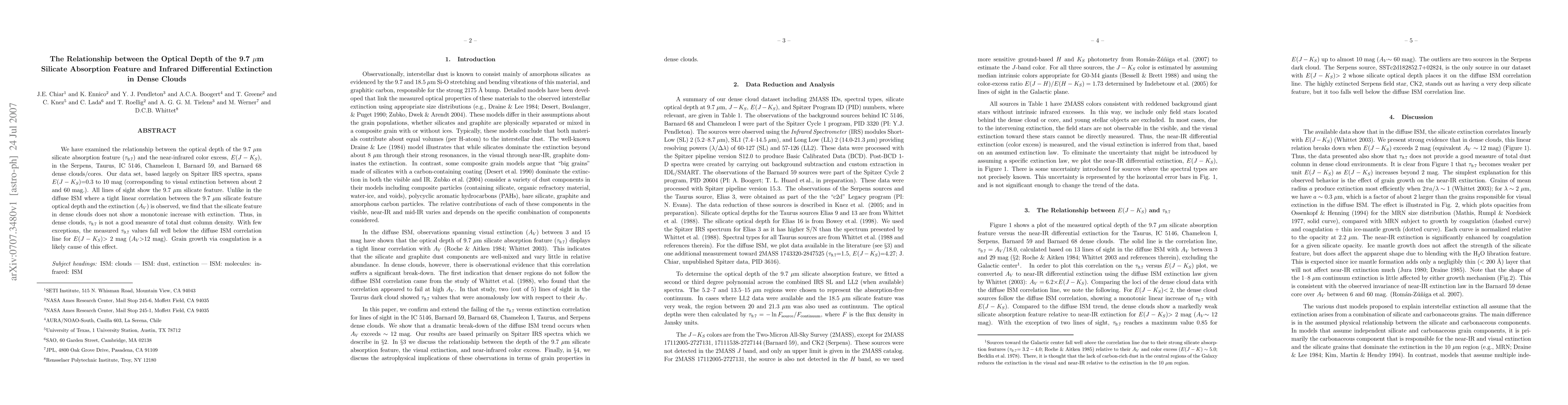 We have examined the relationship between the optical depth of the 9.7 micron silicate absorption feature (tau_9.7) and the near-infrared color excess, E(J-Ks) in the Serpens, Taurus, IC 5146, Chameleon I, Barnard 59, and Barnard 68 dense clouds/cores. Our data set, based largely on Spitzer IRS spectra, spans E(J-Ks)=0.3 to 10 mag (corresponding to visual extinction between about 2 and 60 mag.). All lines of sight show the 9.7 micron silicate feature. Unlike in the diffuse ISM where a tight linear correlation between the 9.7 micron silicate feature optical depth and the extinction (Av) is observed, we find that the silicate feature in dense clouds does not show a monotonic increase with extinction. Thus, in dense clouds, tau_9.7 is not a good measure of total dust column density. With few exceptions, the measured tau_9.7 values fall well below the diffuse ISM correlation line for E(J-Ks) > 2 mag (Av >12 mag). Grain growth via coagulation is a likely cause of this effect.