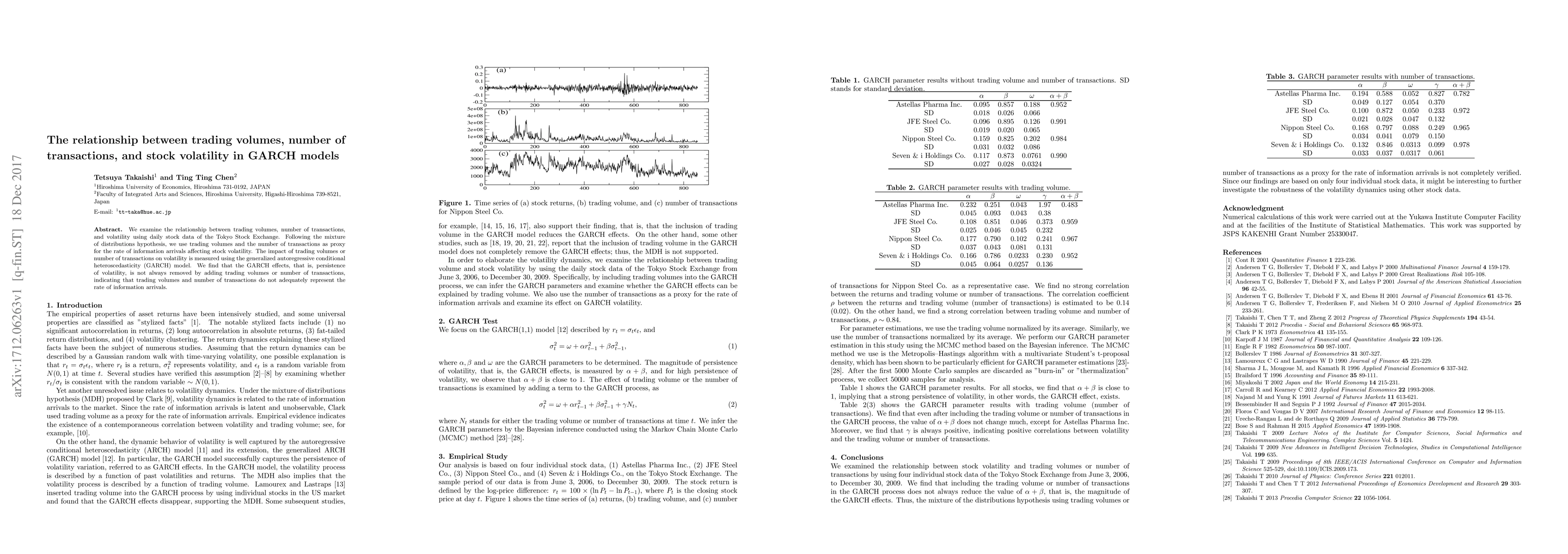 The study investigates the relationship between trading volumes, number of transactions, and stock volatility in GARCH models, finding that these factors do not adequately represent the rate of information arrivals affecting volatility.