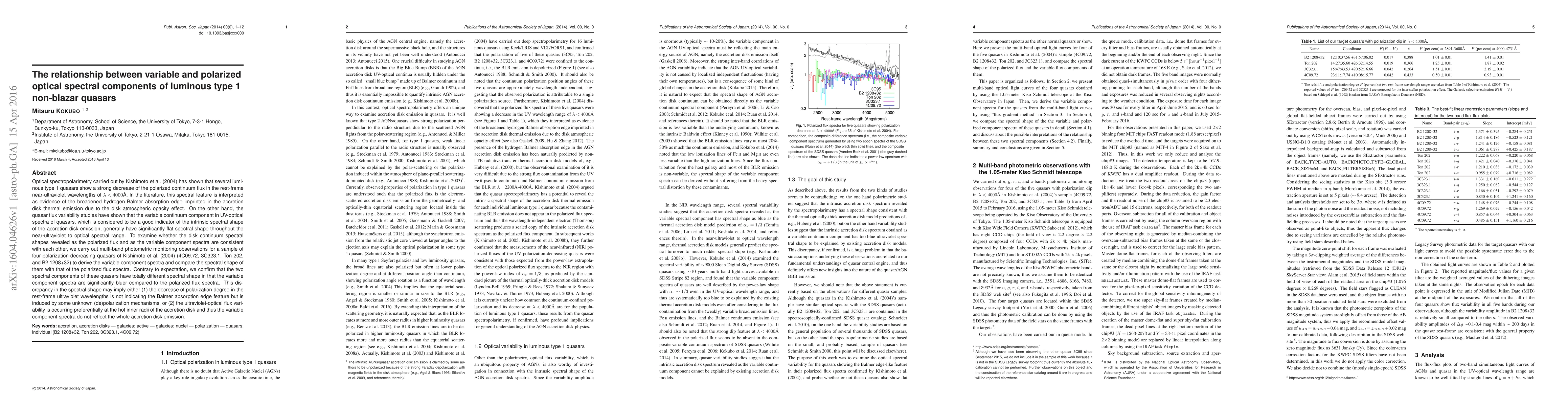 Optical spectropolarimetry carried out by Kishimoto et al. (2004) has shown that several luminous type 1 quasars show a strong decrease of the polarized continuum flux in the rest-frame near-UV wavelengths of $\lambda<4000$\AA. In the literature, this spectral feature is interpreted as evidence of the broadened hydrogen Balmer absorption edge imprinted in the accretion disk thermal emission due to the disk atmospheric opacity effect. On the other hand, the quasar flux variability studies have shown that the variable continuum component in UV-optical spectra of quasars, which is considered to be a good indicator of the intrinsic spectral shape of the accretion disk emission, generally have significantly flat spectral shape throughout the near-UV to optical spectral range. To examine whether the disk continuum spectral shapes revealed as the polarized flux and as the variable component spectra are consistent with each other, we carry out multi-band photometric monitoring observations for a sample of four polarization-decreasing quasars of Kishimoto et al. (2004) (4C09.72, 3C323.1, Ton 202, and B2 1208+32) to derive the variable component spectra and compare the spectral shape of them with that of the polarized flux spectra. Contrary to expectation, we confirm that the two spectral components of these quasars have totally different spectral shape in that the variable component spectra are significantly bluer compared to the polarized flux spectra. This discrepancy in the spectral shape may imply either (1) the decrease of polarization degree in the rest-frame UV wavelengths is not indicating the Balmer absorption edge feature but is induced by some unknown (de)polarization mechanisms, or (2) the UV-optical flux variability is occurring preferentially at the hot inner radii of the accretion disk and thus the variable component spectra do not reflect the whole accretion disk emission.