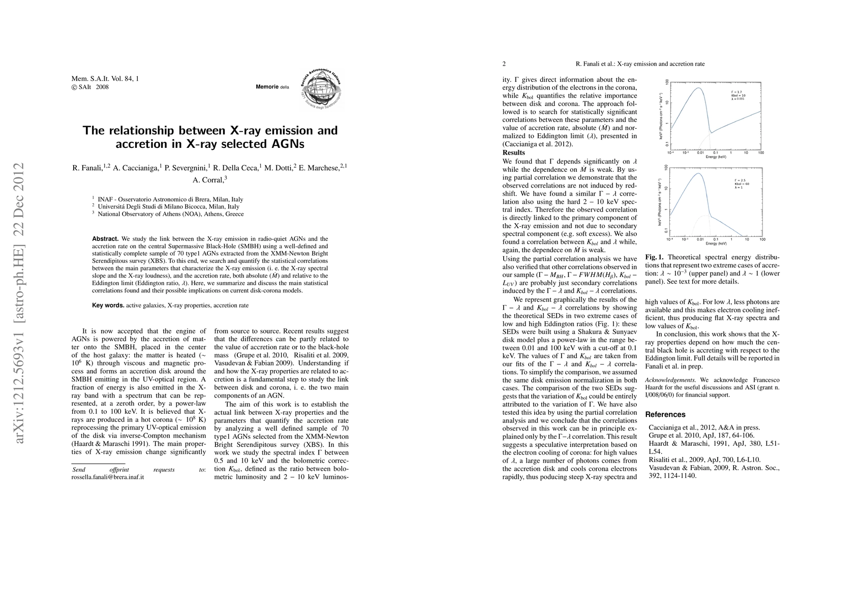 We study the link between the X-ray emission in radio-quiet AGNs and the accretion rate on the central Supermassive Black-Hole (SMBH) using a well-defined and statistically complete sample of 70 type1 AGNs extracted from the XMM-Newton Bright Serendipitous survey (XBS). To this end, we search and quantify the statistical correlations between the main parameters that characterize the X-ray emission (i.e. the X-ray spectral slope and the X-ray loudness), and the accretion rate, both absolute and relative to the Eddington limit (Eddington ratio). Here, we summarize and discuss the main statistical correlations found and their possible implications on current disk-corona models.