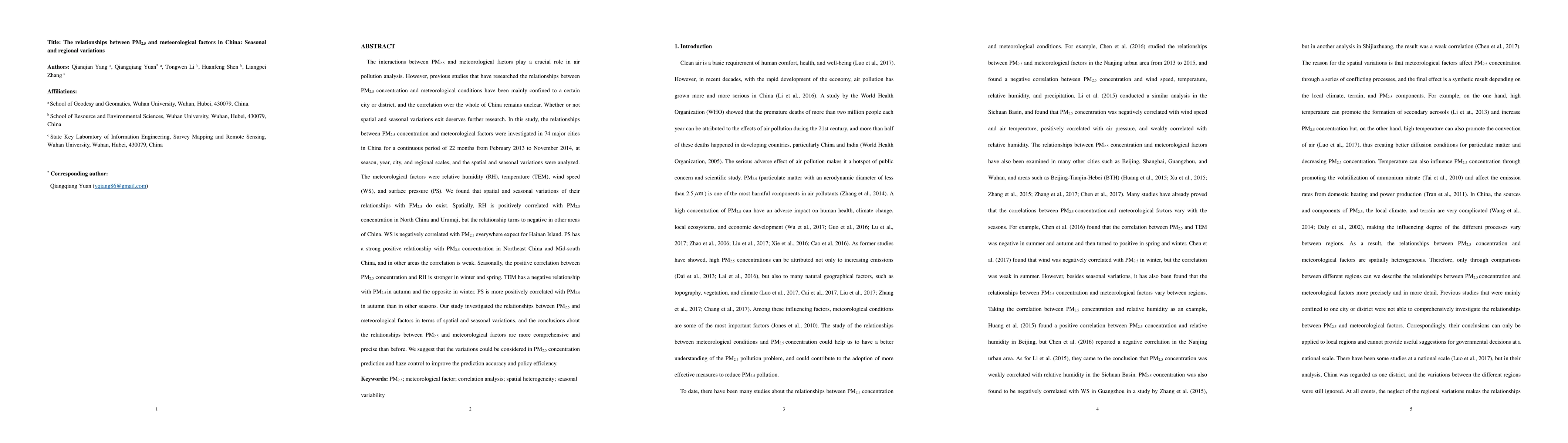 This study investigates the spatial and seasonal variations in the relationships between PM2.5 concentration and meteorological factors (RH, TEM, WS, PS) across 74 major Chinese cities over 22 months. It finds significant spatial and seasonal variations, with RH positively correlating with PM2.5 in North China but negatively elsewhere, and PS showing a strong positive correlation in Northeast and Mid-south China.
