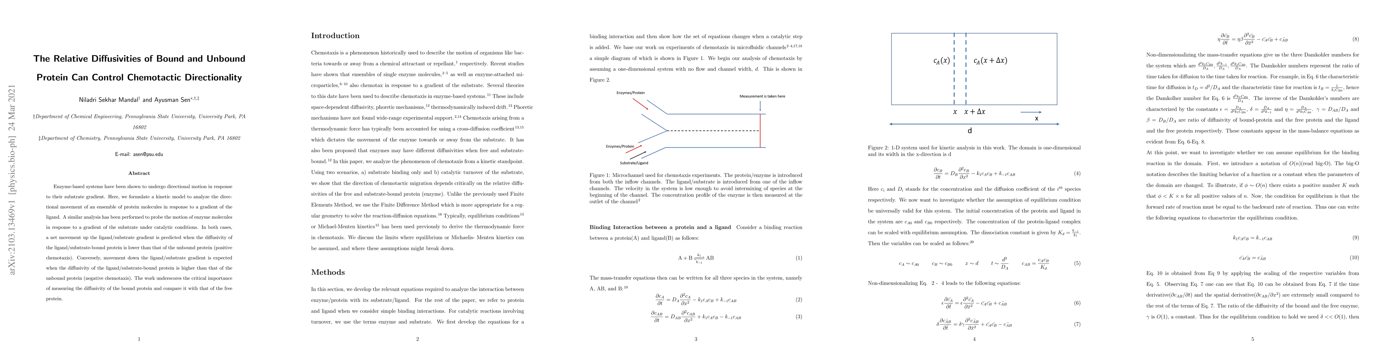 Enzyme-based systems have been shown to undergo directional motion in response to their substrate gradient. Here, we formulate a kinetic model to analyze the directional movement of an ensemble of protein molecules in response to a gradient of the ligand. A similar analysis has been performed to probe the motion of enzyme molecules in response to a gradient of the substrate under catalytic conditions. In both cases, a net movement up the ligand/substrate gradient is predicted when the diffusivity of the ligand/substrate-bound protein is lower than that of the unbound protein (positive chemotaxis). Conversely, movement down the ligand/substrate gradient is expected when the diffusivity of the ligand/substrate-bound protein is higher than that of the unbound protein (negative chemotaxis). The work underscores the critical importance of measuring the diffusivity of the bound protein and compare it with that of the free protein.