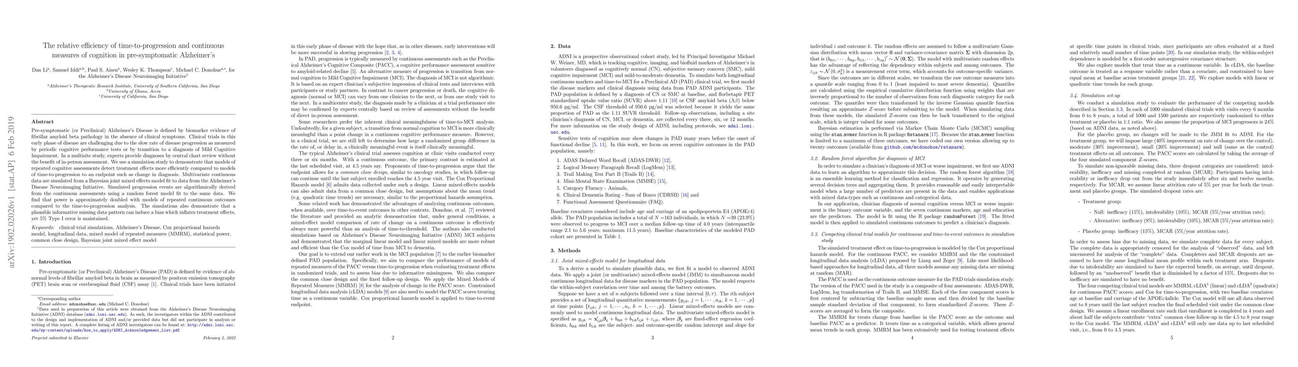Pre-symptomatic (or Preclinical) Alzheimer's Disease is defined by biomarker evidence of fibrillar amyloid beta pathology in the absence of clinical symptoms. Clinical trials in this early phase of disease are challenging due to the slow rate of disease progression as measured by periodic cognitive performance tests or by transition to a diagnosis of Mild Cognitive Impairment. In a multisite study, experts provide diagnoses by central chart review without the benefit of in-person assessment. We use a simulation study to demonstrate that models of repeated cognitive assessments detect treatment effects more efficiently compared to models of time-to-progression to an endpoint such as change in diagnosis. Multivariate continuous data are simulated from a Bayesian joint mixed effects model fit to data from the Alzheimer's Disease Neuroimaging Initiative. Simulated progression events are algorithmically derived from the continuous assessments using a random forest model fit to the same data. We find that power is approximately doubled with models of repeated continuous outcomes compared to the time-to-progression analysis. The simulations also demonstrate that a plausible informative missing data pattern can induce a bias which inflates treatment effects, yet 5% Type I error is maintained.