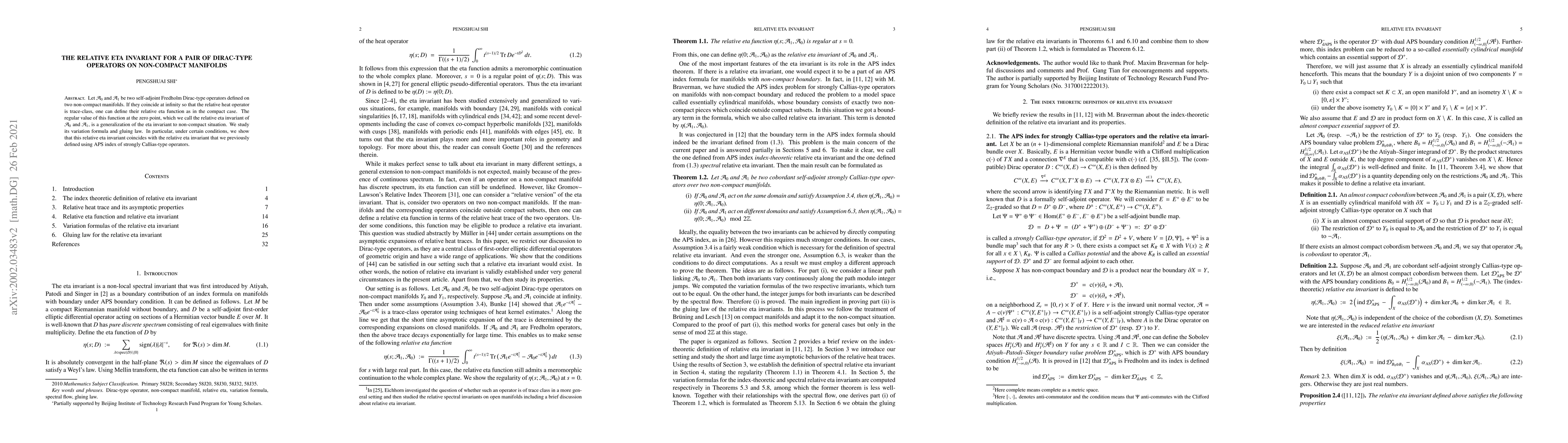 The paper develops the theory of the relative eta invariant for pairs of Dirac-type operators on non-compact manifolds, extending the compact case by defining the relative eta function when the operators coincide at infinity and the relative heat operator is trace-class.
