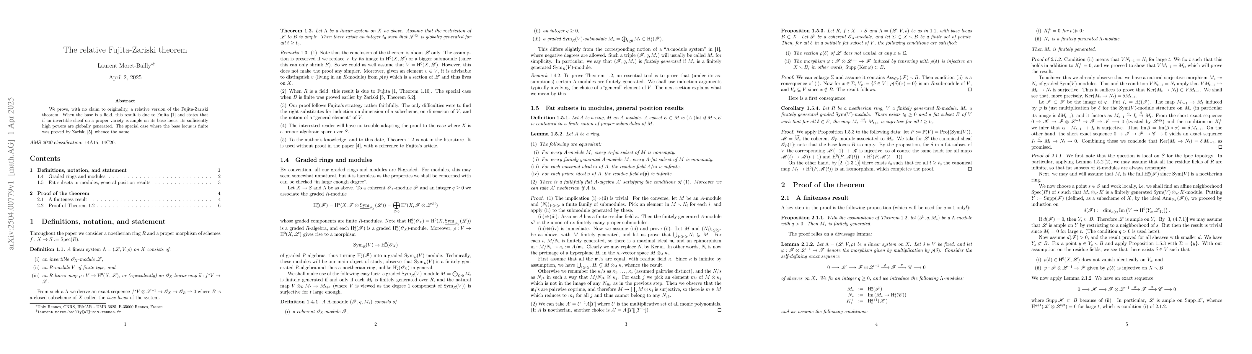 Researchers prove a relative version of the Fujita-Zariski theorem, which states that if an invertible sheaf on a proper variety is ample on its base locus, its high powers are globally generated.
