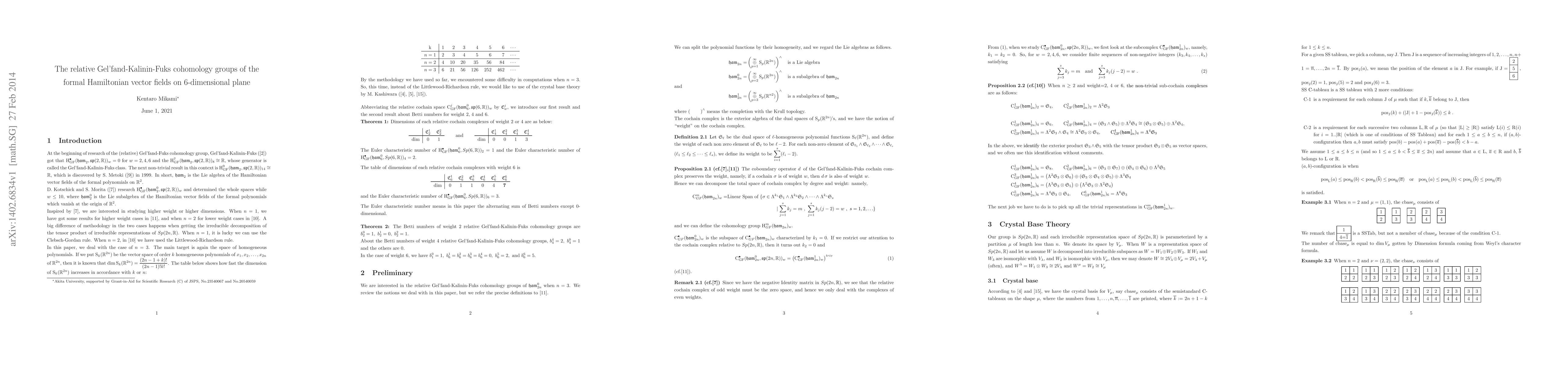 Summary: This paper investigates the relative Gel'fand-Kalinin-Fuks cohomology groups of formal Hamiltonian vector fields on a 6-dimensional plane using Crystal basis theory, focusing on weights 2, 4, and 6. The study provides insights into the algebraic structure of these cohomology groups.