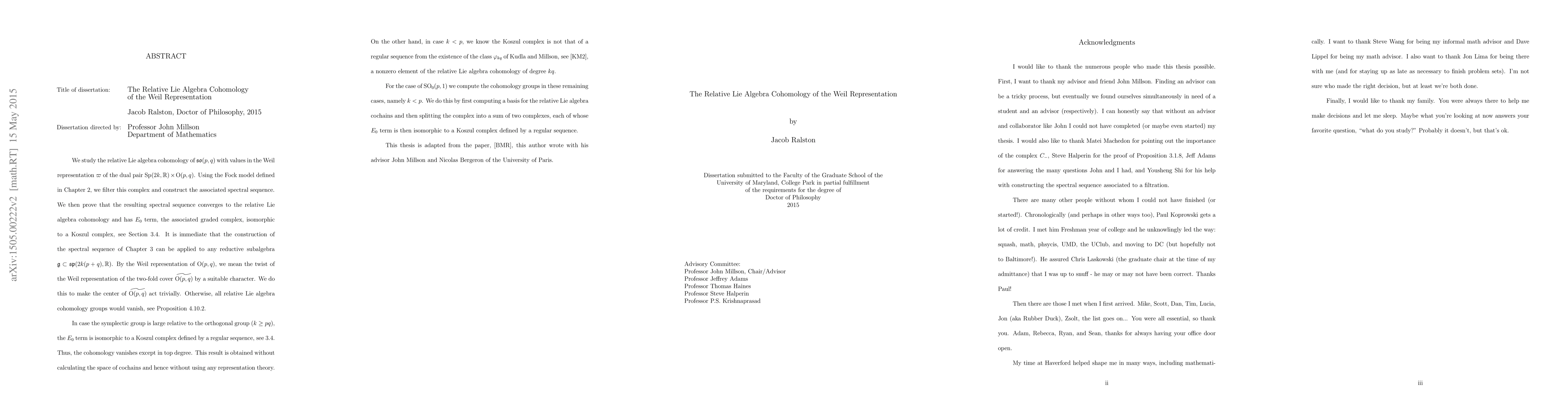 We study the relative Lie algebra cohomology of $\mathfrak{so}(p,q)$ with values in the Weil representation $\varpi$ of the dual pair $\mathrm{Sp}(2k, \mathbb{R}) \times \mathrm{O}(p,q)$. Using the Fock model we filter this complex and construct the associated spectral sequence. We then prove that the resulting spectral sequence converges to the relative Lie algebra cohomology and has $E_0$ term, the associated graded complex, isomorphic to a Koszul complex. It is immediate that the construction of the spectral sequence of Chapter 3 can be applied to any reductive subalgebra $\mathfrak{g} \subset \mathfrak{sp}(2k(p+q), \mathbb{R})$. In case the symplectic group is large relative to the orthogonal group ($k \geq pq$), the $E_0$ term is isomorphic to a Koszul complex defined by a regular sequence, see 3.4. Thus, the cohomology vanishes except in top degree. This result is obtained without calculating the space of cochains and hence without using any representation theory. On the other hand, in case $k < p$, we know the Koszul complex is not that of a regular sequence from the existence of the class $\varphi_{kq}$ of Kudla and Millson, see [KM2], a nonzero element of the relative Lie algebra cohomology of degree $kq$. For the case of $\mathrm{SO}_0(p,1)$ we compute the cohomology groups in these remaining cases, namely $k < p$. We do this by first computing a basis for the relative Lie algebra cochains and then splitting the complex into a sum of two complexes, each of whose $E_0$ term is then isomorphic to a Koszul complex defined by a regular sequence. This thesis is adapted from the paper, [BMR], this author wrote with his advisor John Millson and Nicolas Bergeron of the University of Paris.