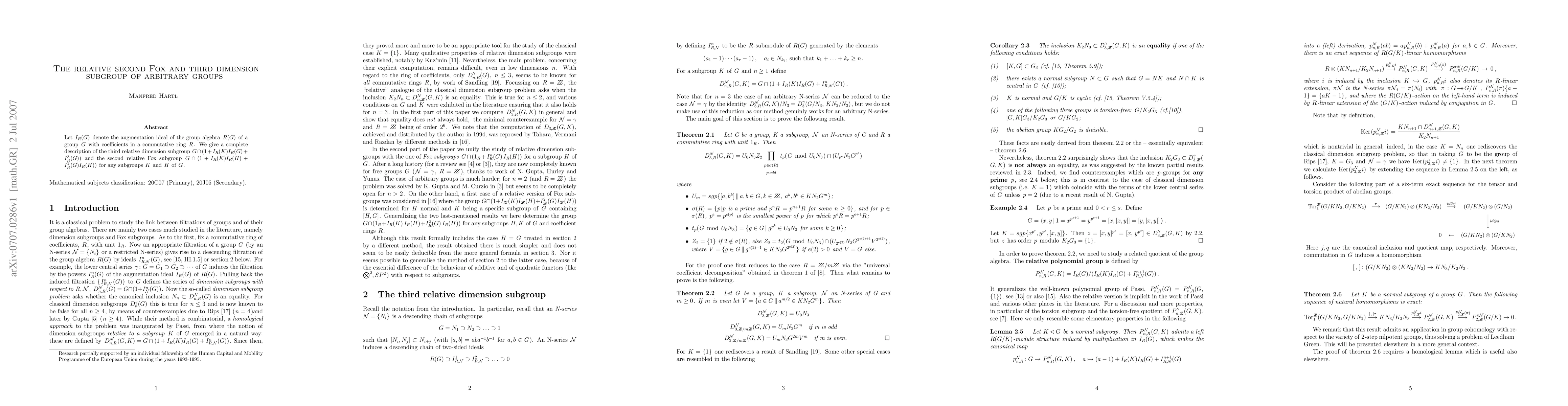 Let $I_R(G)$ denote the augmentation ideal of the group algebra $R(G)$ of a group $G$ with coefficients in a commutative ring $R$. We give a complete description of the third relative dimension subgroup $G\cap(1+I_R(K)I_R(G)+I^3_R(G))$ and the second relative Fox subgroup $G\cap(1+I_R(K)I_R(H)+I^2_R(G)I_R(H))$ for any subgroups $K$ and $H$ of $G$.