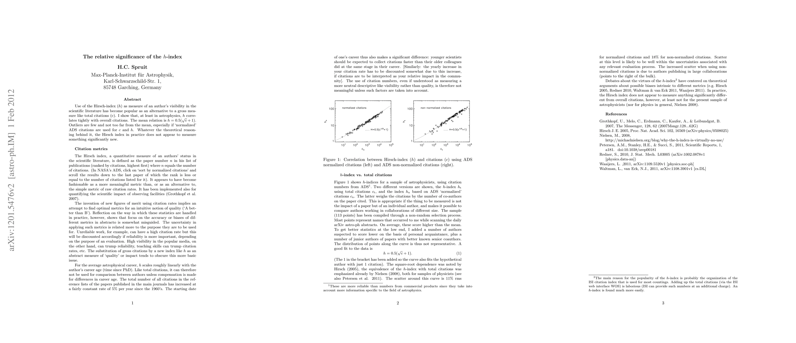 Use of the Hirsch-index ($h$) as measure of an author's visibility in the scientific literature has become popular as an alternative to a gross measure like total citations (c). I show that, at least in astrophysics, $h$ correlates tightly with overall citations. The mean relation is $h=0.5(\sqrt c+1)$. Outliers are few and not too far from the mean, especially if `normalized' ADS citations are used for $c$ and $h$. Whatever the theoretical reasoning behind it, the Hirsch index in practice does not appear to measure something significantly new.