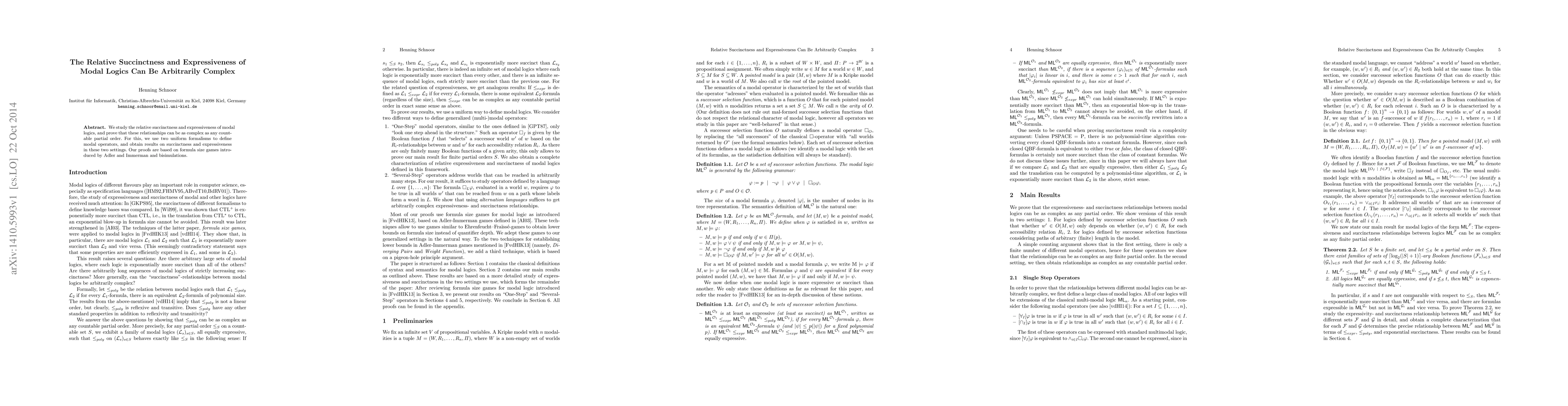 We study the relative succinctness and expressiveness of modal logics, and prove that these relationships can be as complex as any countable partial order. For this, we use two uniform formalisms to define modal operators, and obtain results on succinctness and expressiveness in these two settings. Our proofs are based on formula size games introduced by Adler and Immerman and bisimulations.
