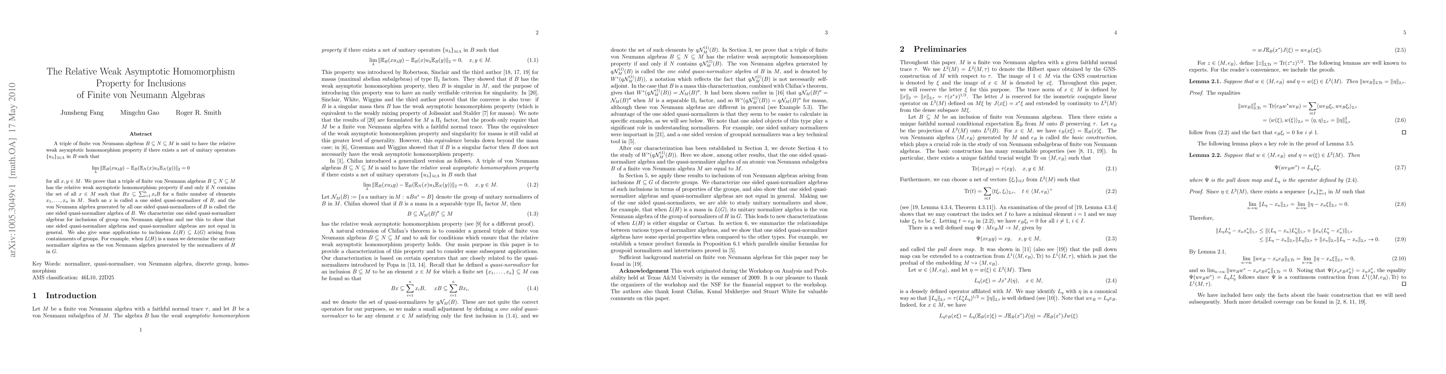 A triple of finite von Neumann algebras $B\subseteq N\subseteq M$ is said to have the relative weak asymptotic homomorphism property if there exists a net of unitary operators $\{u_{\lambda}\}_{\lambda\in \Lambda}$ in $B$ such that $$\lim_{\lambda}|\mathbb{E}}_B(xu_{\lambda}y)-{\mathbb{E}}_B({\mathbb{E}}_N(x)u_{\lambda}{\mathbb{E}}_N(y))\|_2=0$$ for all $x,y\in M$. We prove that a triple of finite von Neumann algebras $B\subseteq N\subseteq M$ has the relative weak asymptotic homomorphism property if and only if $N$ contains the set of all $x\in M$ such that $Bx\subseteq \sum_{i=1}^n x_iB$ for a finite number of elements $x_1,...,x_n$ in $M$. Such an $x$ is called a one sided quasi-normalizer of $B$, and the von Neumann algebra generated by all one sided quasi-normalizers of $B$ is called the one sided quasi-normalizer algebra of $B$. We characterize one sided quasi-normalizer algebras for inclusions of group von Neumann algebras and use this to show that one sided quasi-normalizer algebras and quasi-normalizer algebras are not equal in general. We also give some applications to inclusions $L(H)\subseteq L(G)$ arising from containments of groups. For example, when $L(H)$ is a masa we determine the unitary normalizer algebra as the von Neumann algebra generated by the normalizers of $H$ in $G$.