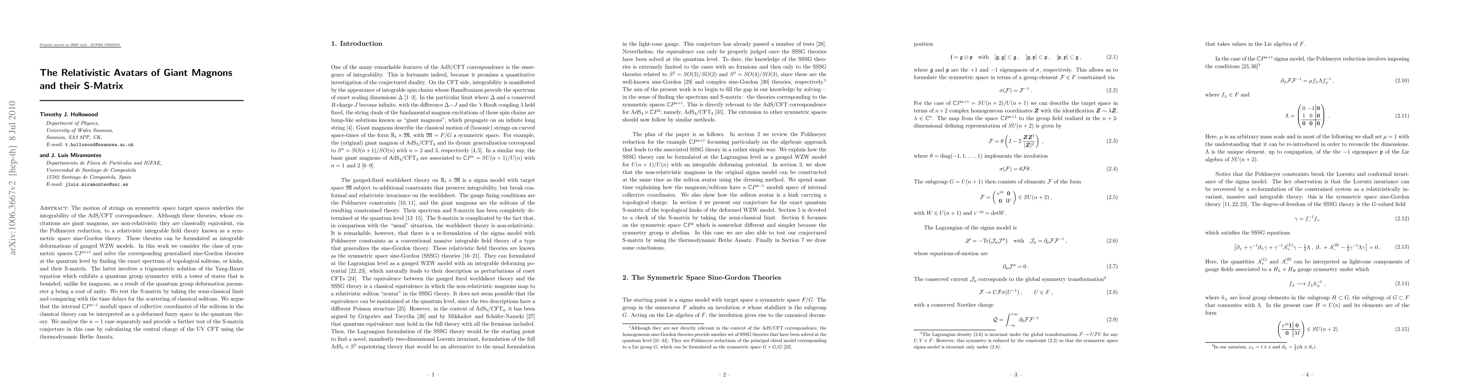 The motion of strings on symmetric space target spaces underlies the integrability of the AdS/CFT correspondence. Although these theories, whose excitations are giant magnons, are non-relativistic they are classically equivalent, via the Polhmeyer reduction, to a relativistic integrable field theory known as a symmetric space sine-Gordon theory. These theories can be formulated as integrable deformations of gauged WZW models. In this work we consider the class of symmetric spaces CP^{n+1} and solve the corresponding generalized sine-Gordon theories at the quantum level by finding the exact spectrum of topological solitons, or kinks, and their S-matrix. The latter involves a trignometric solution of the Yang-Baxer equation which exhibits a quantum group symmetry with a tower of states that is bounded, unlike for magnons, as a result of the quantum group deformation parameter q being a root of unity. We test the S-matrix by taking the semi-classical limit and comparing with the time delays for the scattering of classical solitons. We argue that the internal CP^{n-1} moduli space of collective coordinates of the solitons in the classical theory can be interpreted as a q-deformed fuzzy space in the quantum theory. We analyse the n=1 case separately and provide a further test of the S-matrix conjecture in this case by calculating the central charge of the UV CFT using the thermodynamic Bethe Ansatz.