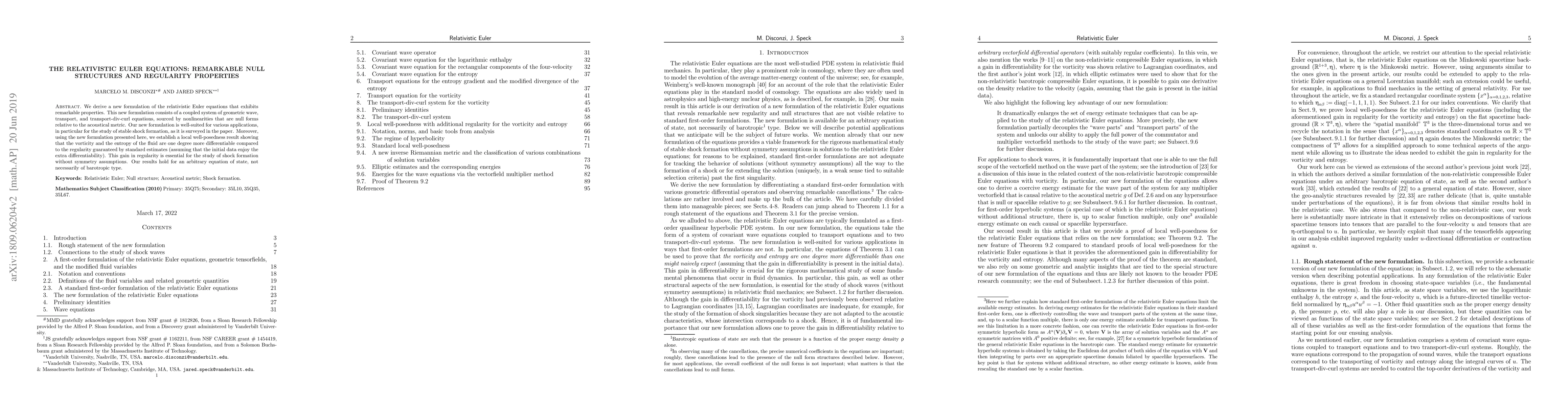 The paper presents a new formulation of the relativistic Euler equations that exhibits remarkable properties, including improved regularity for studying shock formation without symmetry assumptions.