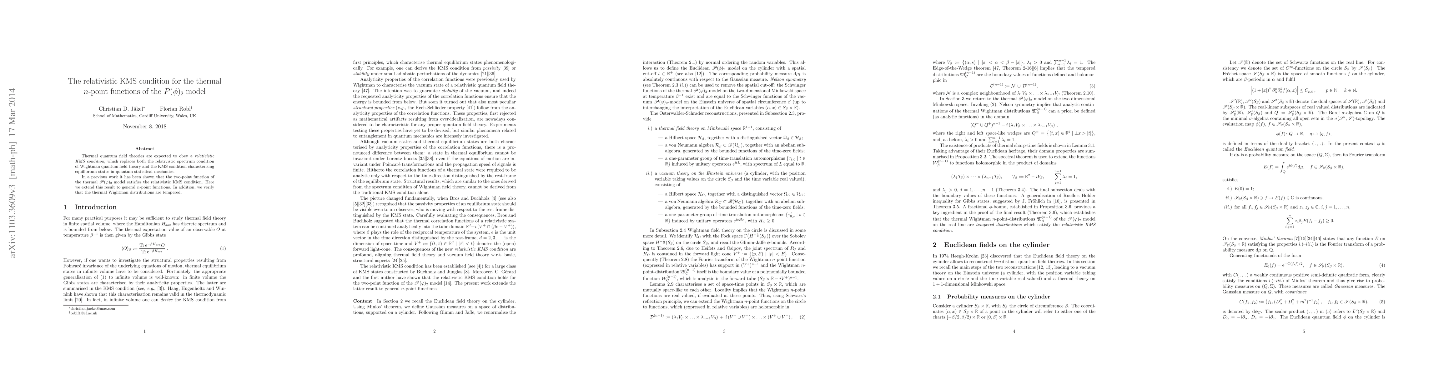 Thermal quantum field theories are expected to obey a relativistic KMS condition, which replaces both the relativistic spectrum condition of Wightman quantum field theory and the KMS condition, which characterises equilibrium states in quantum statistical mechanics. In a previous work it has been shown that the two-point function of the thermal $P(\phi)_2$ model satisfies the relativistic KMS condition. Here we extend this result to general $n$-point functions.