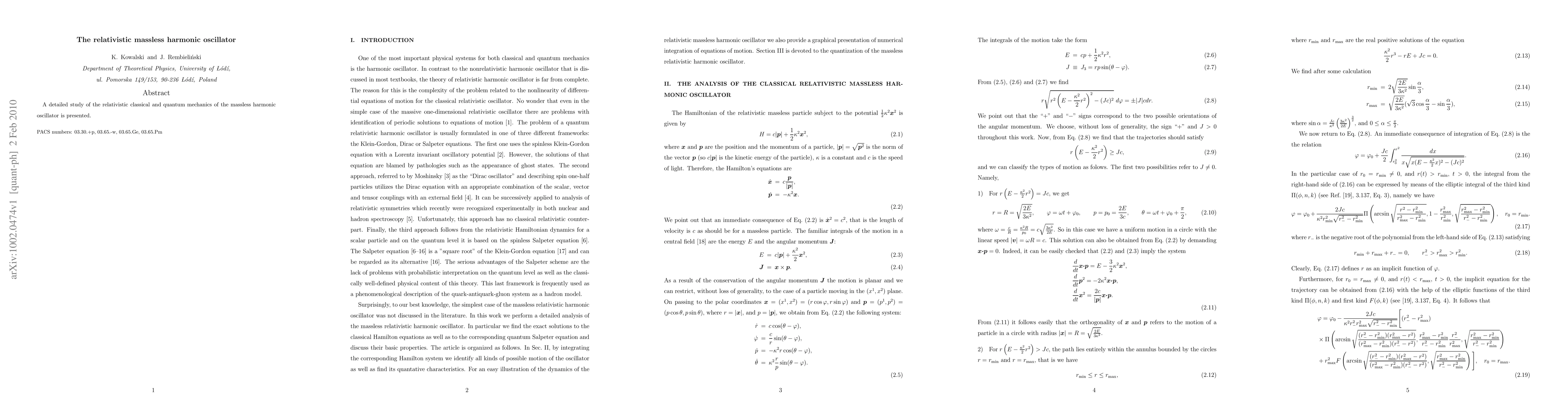 This research investigates both classical and quantum versions of the relativistic massless harmonic oscillator, exploring the unique dynamics and properties that arise without mass considerations.