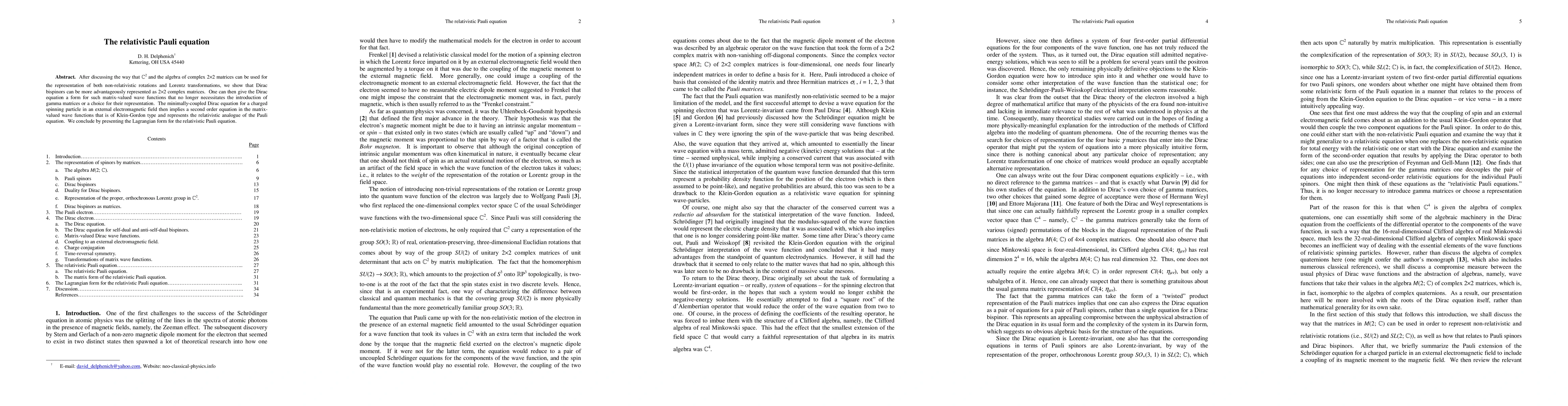 After discussing the way that C2 and the algebra of complex 2x2 matrices can be used for the representation of both non-relativistic rotations and Lorentz transformations, we show that Dirac bispinors can be more advantageously represented as 2x2 complex matrices. One can then give the Dirac equation a form for such matrix-valued wave functions that no longer necessitates the introduction of gamma matrices or a choice for their representation. The minimally-coupled Dirac equation for a charged spinning particle in an external electromagnetic field then implies a second order equation in the matrix-valued wave functions that is of Klein-Gordon type and represents the relativistic analogue of the Pauli equation. We conclude by presenting the Lagrangian form for the relativistic Pauli equation.