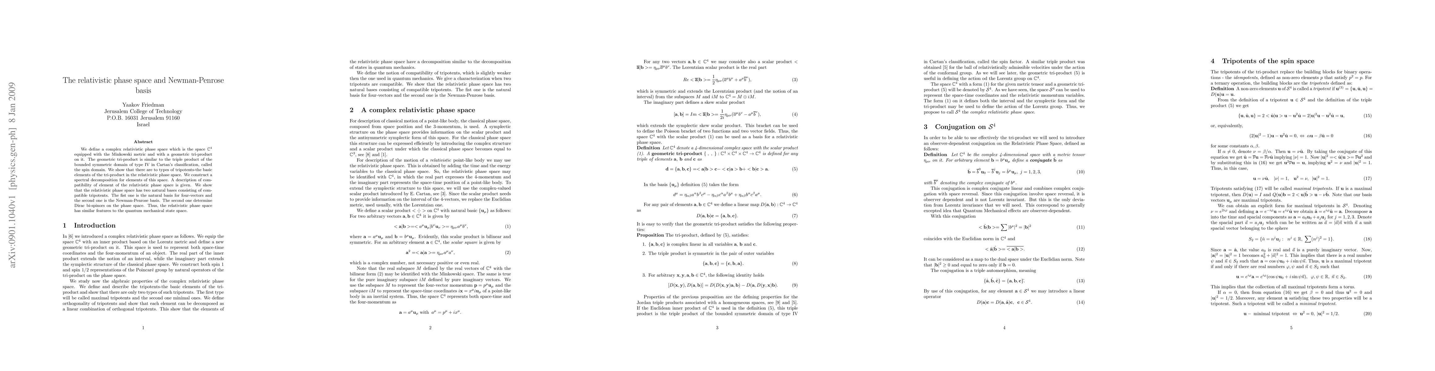 We define a complex relativistic phase space which is the space $\mathbb{C}^4$ equipped with the Minkowski metric and with a geometric tri-product on it. The geometric tri-product is similar to the triple product of the bounded symmetric domain of type IV in Cartan's classification, called the spin domain. We show that there are to types of tripotents-the basic elements of the tri-product in the relativistic phase space. We construct a spectral decomposition for elements of this space. A description of compatibility of element of the relativistic phase space is given. We show that the relativistic phase space has two natural bases consisting of compatible tripotents. The fist one is the natural basis for four-vectors and the second one is the Newman-Penrose basis. The second one determine Dirac bi-spinors on the phase space. Thus, the relativistic phase space has similar features to the quantum mechanical state space.