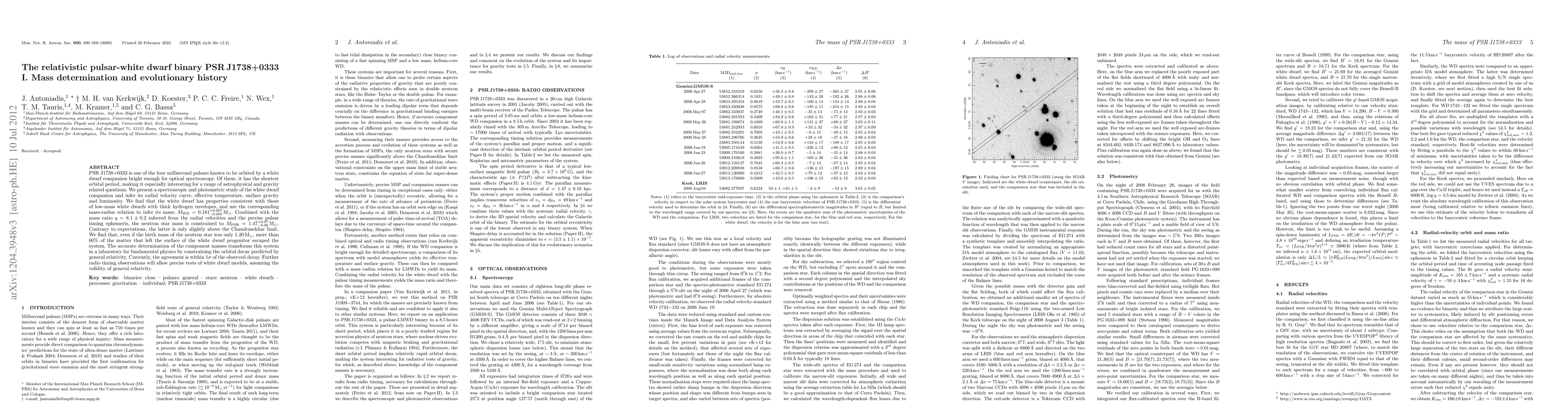 The paper presents a study on the relativistic pulsar-white dwarf binary PSR J1738+0333, determining the white dwarf's mass (0.181 ± 0.007 ± 0.005 solar masses) and neutron star mass (1.47 ± 0.07 ± 0.06 solar masses). Surprisingly, the neutron star mass is only slightly above the Chandrasekhar limit. The research also reveals that more than 60% of matter ejected from the white dwarf progenitor likely escaped the system, making PSR J1738+0333 a 'laboratory' for testing general relativity and white dwarf models.