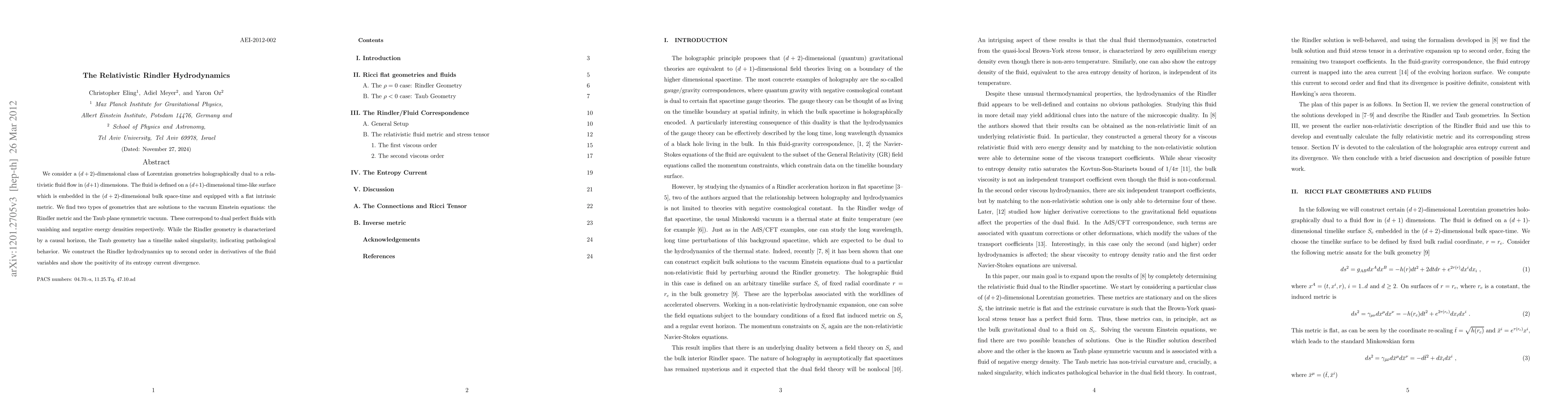 This paper explores relativistic hydrodynamics in a (d+2)-dimensional Lorentzian geometry holographically dual to a (d+1)-dimensional fluid flow, finding the Rindler and Taub metrics as solutions. It constructs Rindler hydrodynamics up to second-order derivatives, demonstrating the positivity of its entropy current divergence.
