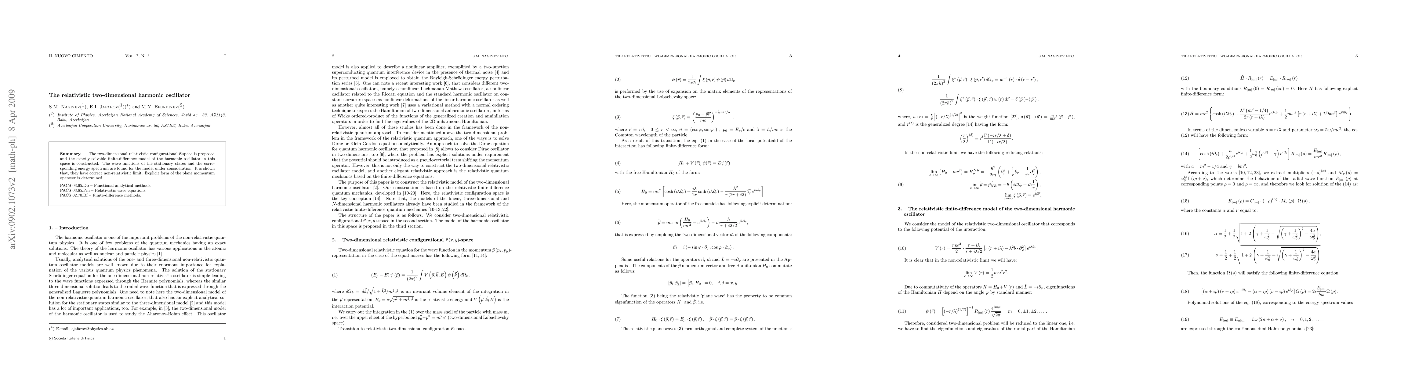 This paper constructs a two-dimensional relativistic harmonic oscillator model using finite-difference methods, deriving exact wave functions and energy spectra that correctly reduce to the non-relativistic limit, and determines the explicit form of the plane momentum operator.