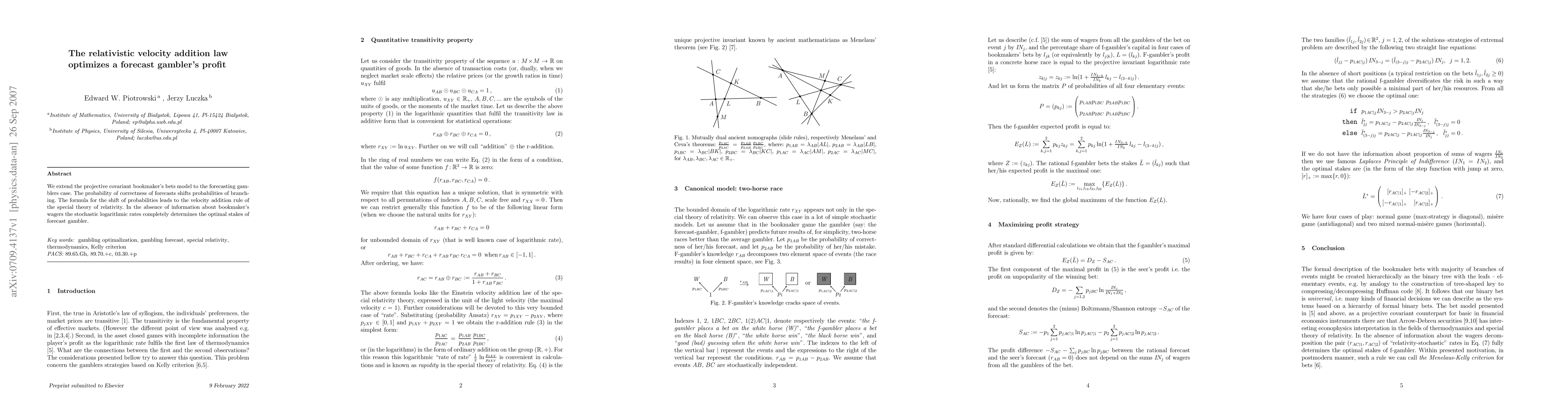 We extend the projective covariant bookmaker's bets model to the forecasting gamblers case. The probability of correctness of forecasts shifts probabilities of branching. The formula for the shift of probabilities leads to the velocity addition rule of the special theory of relativity. In the absence of information about bookmaker's wagers the stochastic logarithmic rates completely determines the optimal stakes of forecast gambler.
