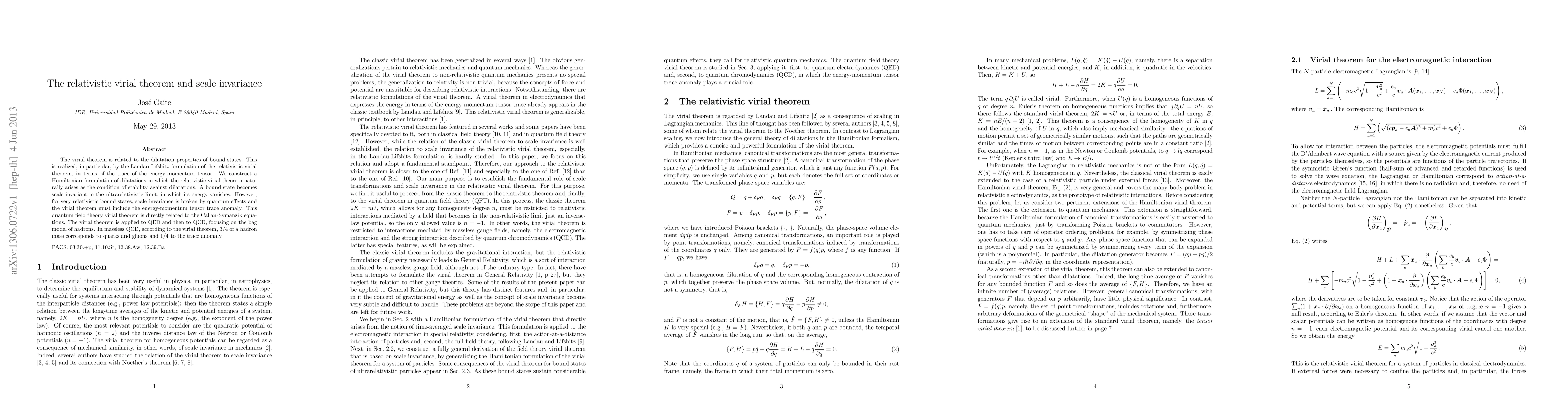 This paper explores the relativistic virial theorem and its connection to scale invariance, showing how it emerges from the stability of dilatations in a Hamiltonian framework. It applies the theorem to quantum electrodynamics (QED) and quantum chromodynamics (QCD), revealing that in massless QCD, 3/4 of a hadron's mass arises from quarks and gluons, while 1/4 is due to the trace anomaly.
