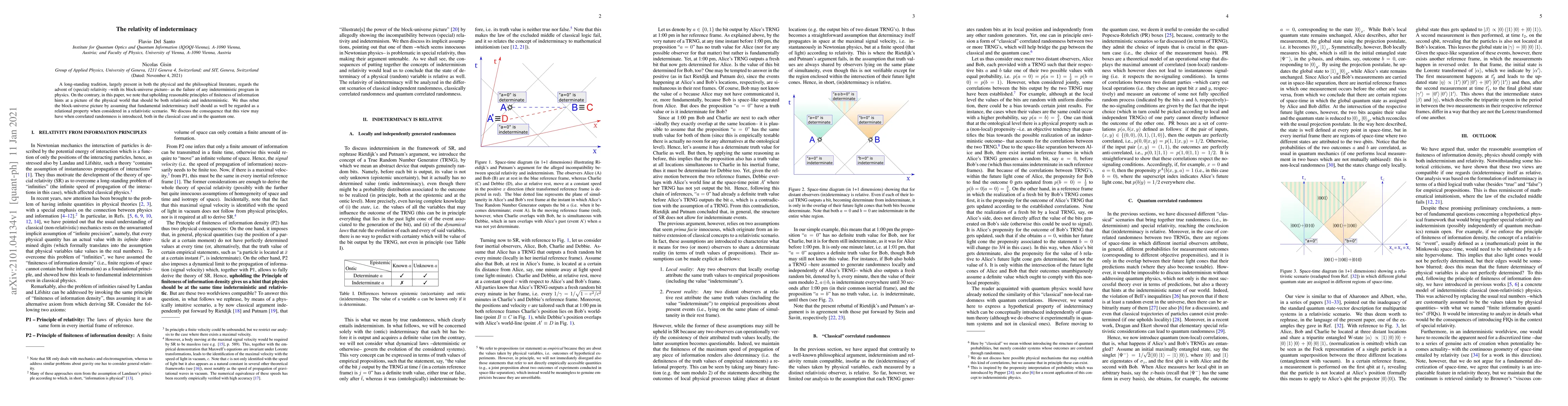 A long-standing tradition, largely present in both the physical and the philosophical literature, regards the advent of (special) relativity -- with its block-universe picture -- as the failure of any indeterministic program in physics. On the contrary, in this paper, we note that upholding reasonable principles of finiteness of information hints at a picture of the physical world that should be both relativistic and indeterministic. We thus rebut the block-universe picture by assuming that fundamental indeterminacy itself should as well be regarded as a relational property when considered in a relativistic scenario. We discuss the consequence that this view may have when correlated randomness is introduced, both in the classical case and in the quantum one.