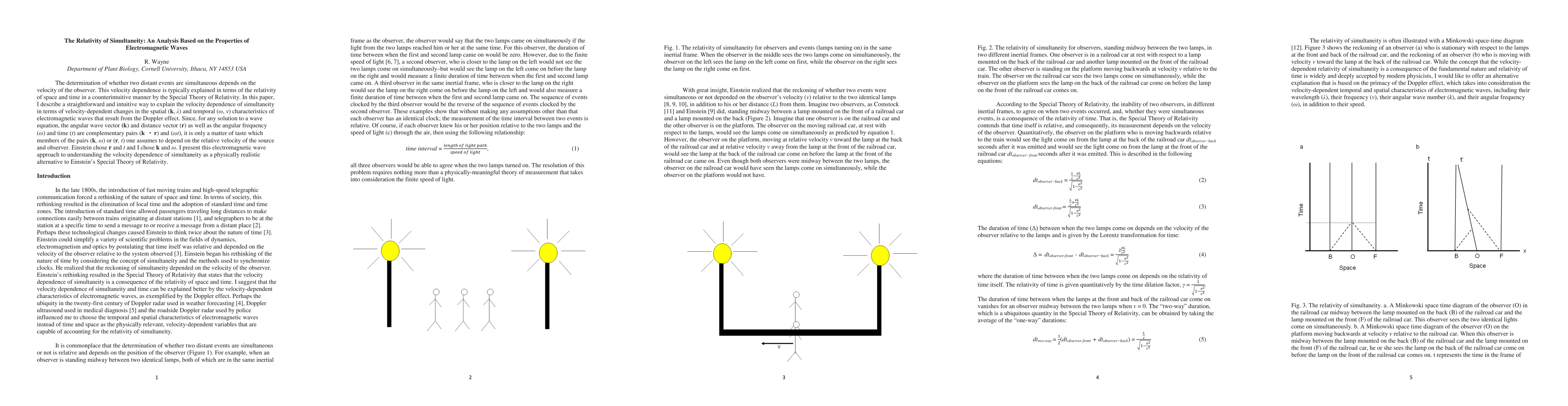 The determination of whether two distant events are simultaneous depends on the velocity of the observer. This velocity dependence is typically explained in terms of the relativity of space and time in a counterintuitive manner by the Special Theory of Relativity. In this paper, I describe a straightforward and intuitive way to explain the velocity dependence of simultaneity in terms of velocity-dependent changes in the spatial (k, {\lambda}) and temporal ({\omega}, {\nu}) characteristics of electromagnetic waves that result from the Doppler effect. Since, for any solution to a wave equation, the angular wave vector (k) and distance vector (r) as well as the angular frequency ({\omega}) and time (t) are complementary pairs (k *r) and ({\omega}t), it is only a matter of taste which members of the pairs (k, {\omega}) or (r, t) one assumes to depend on the relative velocity of the source and observer. Einstein chose r and t and I chose k and {\omega}. I present this electromagnetic wave approach to understanding the velocity dependence of simultaneity as a physically realistic alternative to Einstein's Special Theory of Relativity.