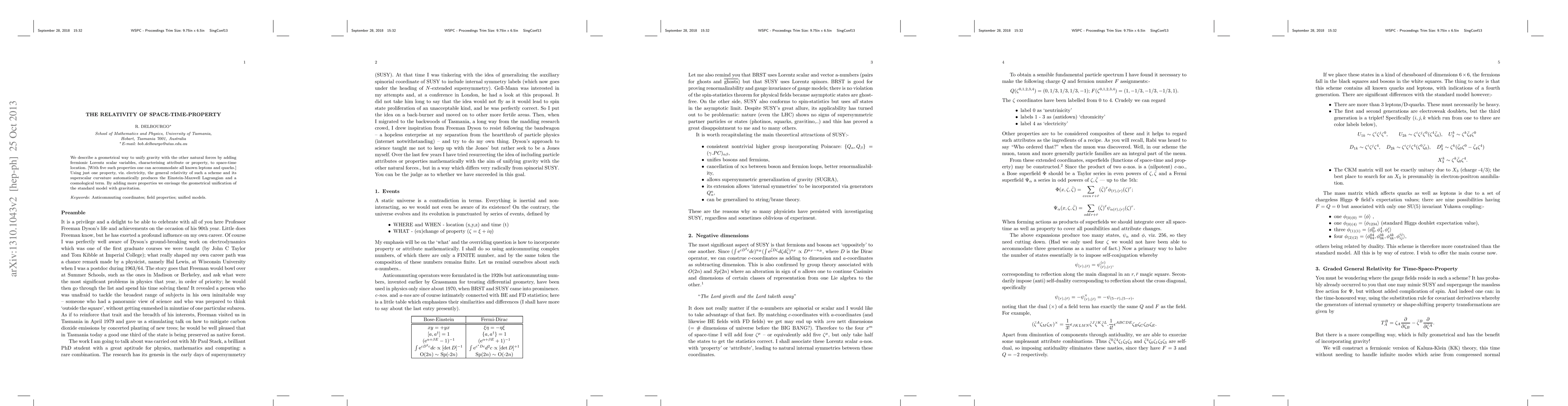 We describe a geometrical way to unify gravity with the other natural forces by adding fermionic Lorentz scalar variables, characterising attribute, or property, to space-time location. [With five such properties one can accommodate all known leptons and quarks.] Using just one property, viz. electricity, the general relativity of such a scheme and its superscalar curvature automatically produces the Einstein-Maxwell Lagrangian and a cosmological term. By adding more properties we envisage the geometrical unification of the standard model with gravitation.
