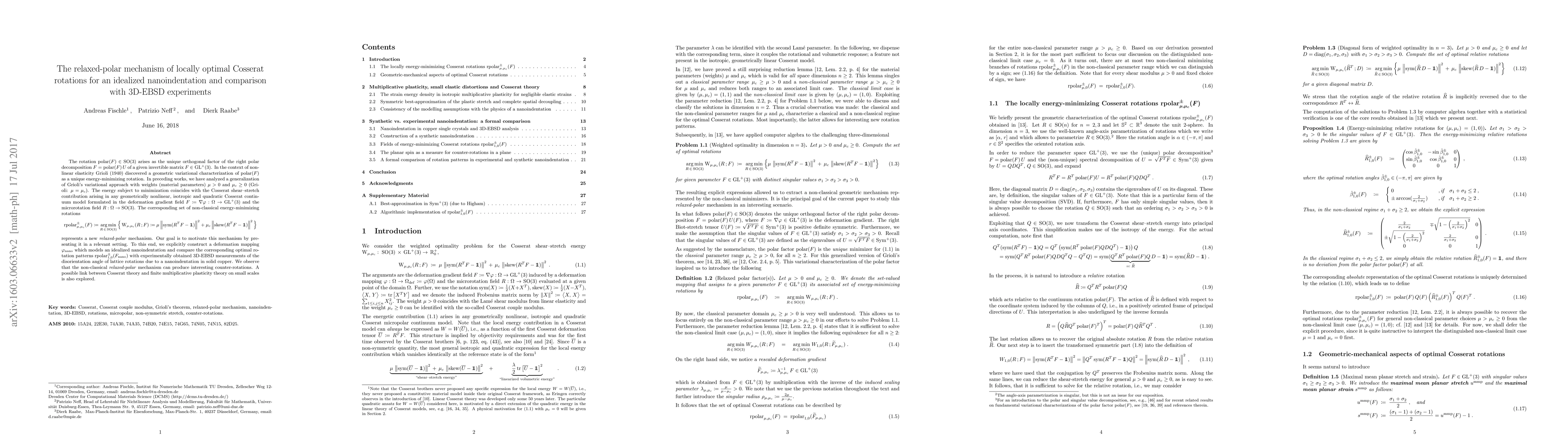 The rotation ${\rm polar}(F) \in {\rm SO}(3)$ arises as the unique orthogonal factor of the right polar decomposition $F = {\rm polar}(F) \cdot U$ of a given invertible matrix $F \in {\rm GL}^+(3)$. In the context of nonlinear elasticity Grioli (1940) discovered a geometric variational characterization of ${\rm polar}(F)$ as a unique energy-minimizing rotation. In preceding works, we have analyzed a generalization of Grioli's variational approach with weights (material parameters) $\mu > 0$ and $\mu_c \geq 0$ (Grioli: $\mu = \mu_c$). The energy subject to minimization coincides with the Cosserat shear-stretch contribution arising in any geometrically nonlinear, isotropic and quadratic Cosserat continuum model formulated in the deformation gradient field $F := \nabla\varphi: \Omega \to {\rm GL}^+(3)$ and the microrotation field $R: \Omega \to {\rm SO}(3)$. The corresponding set of non-classical energy-minimizing rotations $$ {\rm rpolar}^\pm_{\mu,\mu_c}(F) := \substack{{\rm argmin}\\ R\,\in\,{\rm SO(3)}} \Big\{ W_{\mu, \mu_c}(R\,;F) := \mu\, || {\rm sym}(R^TF - 1)||^2 + \mu_c\, ||{\rm skew}(R^TF - 1)||^2 \Big\} $$ represents a new relaxed-polar mechanism. Our goal is to motivate this mechanism by presenting it in a relevant setting. To this end, we explicitly construct a deformation mapping $\varphi_{\rm nano}$ which models an idealized nanoindentation and compare the corresponding optimal rotation patterns ${\rm rpolar}^\pm_{1,0}(F_{\rm nano})$ with experimentally obtained 3D-EBSD measurements of the disorientation angle of lattice rotations due to a nanoindentation in solid copper. We observe that the non-classical relaxed-polar mechanism can produce interesting counter-rotations. A possible link between Cosserat theory and finite multiplicative plasticity theory on small scales is also explored.