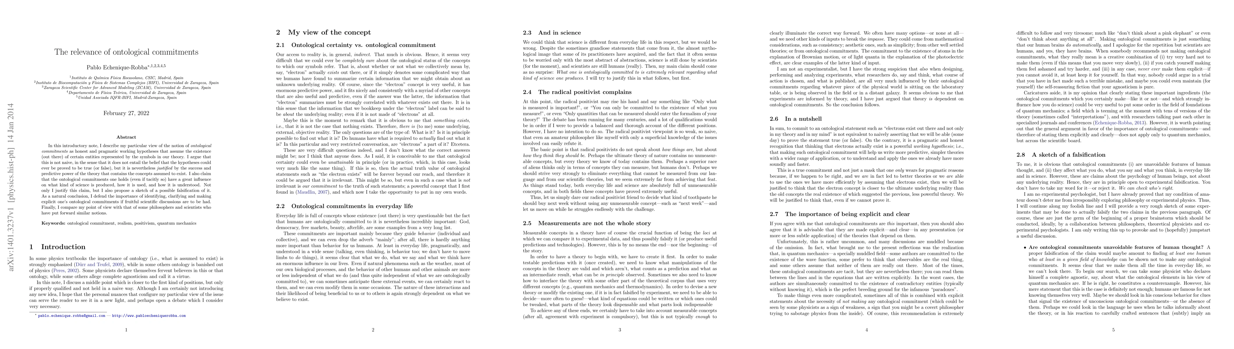 In this introductory note, I describe my particular view of the notion of ontological commitments as honest and pragmatic working hypotheses that assume the existence (out there) of certain entities represented by the symbols in our theory. I argue that this is not naive, in the sense that it does not entail the belief that the hypotheses could ever be proved to be true (or false), but it is nevertheless justified by the success and predictive power of the theory that contains the concepts assumed to exist. I also claim that the ontological commitments one holds (even if tacitly so) have a great influence on what kind of science is produced, how it is used, and how it is understood. Not only I justify this claim, but I also propose a sketch of a possible falsification of it. As a natural conclusion, I defend the importance of identifying, clarifying and making explicit one's ontological commitments if fruitful scientific discussions are to be had. Finally, I compare my point of view with that of some philosophers and scientists who have put forward similar notions.