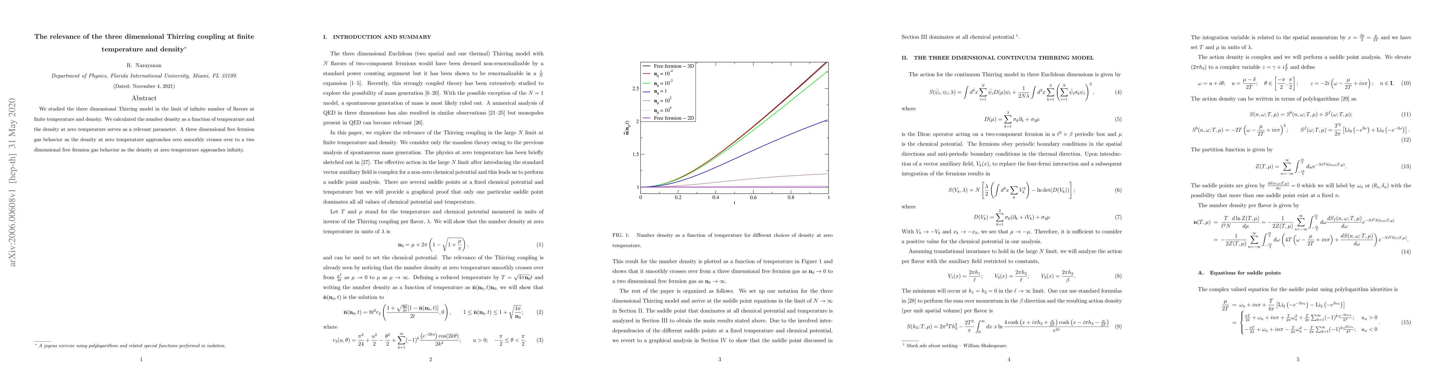 This paper investigates the three-dimensional Thirring model at finite temperature and density, revealing a crossover from three-dimensional to two-dimensional free fermion gas behavior as the zero-temperature density varies. The study calculates the number density as a function of temperature, highlighting the model's relevance in different density regimes.