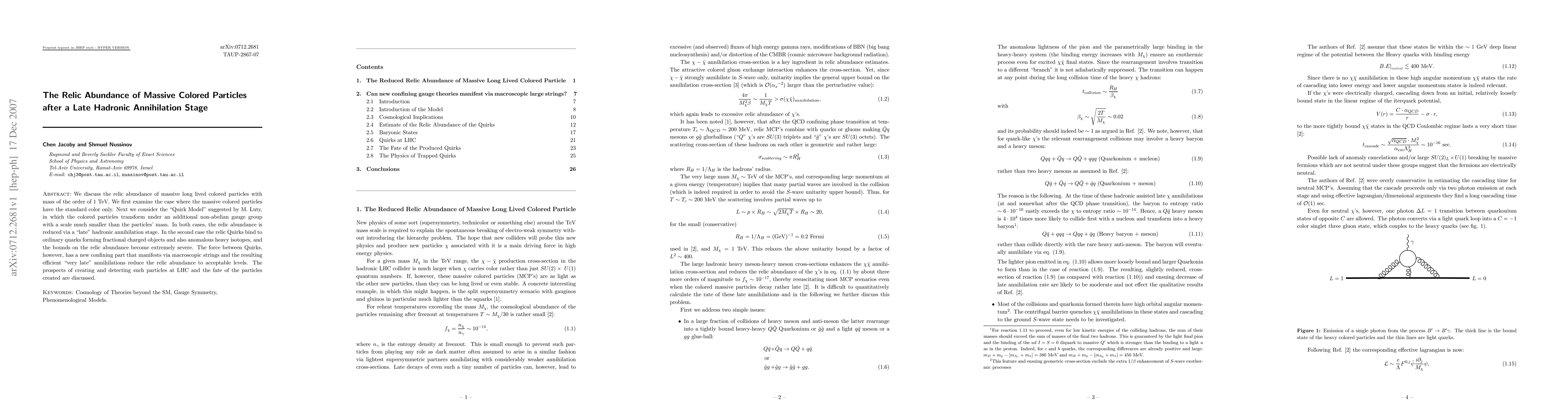 This paper explores the relic abundance of massive, long-lived colored particles, reducing it via late hadronic annihilation stages. It examines both standard color and the 'Quirk Model', where particles transform under a smaller non-abelian gauge group, forming fractional charged objects and heavy isotopes. The Quirk Model's new confining force, via macroscopic strings, efficiently reduces relic abundance to acceptable levels, with implications for LHC detection discussed.