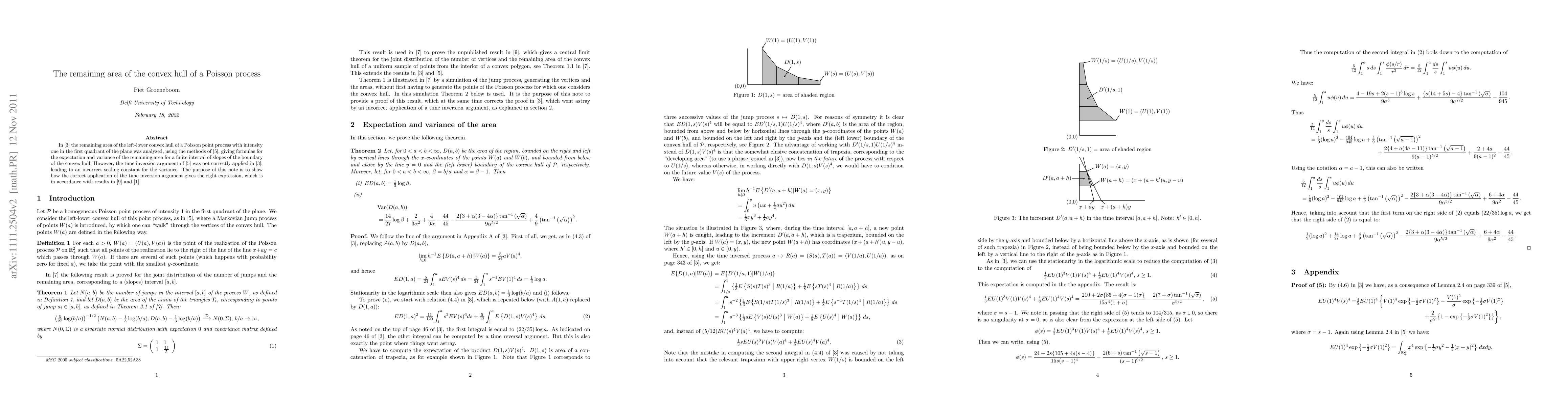 In Cabo and Groeneboom (1994) the remaining area of the left-lower convex hull of a Poisson point process with intensity one in the first quadrant of the plane was analyzed, using the methods of Groeneboom (1988), giving formulas for the expectation and variance of the remaining area for a finite interval of slopes of the boundary of the convex hull. However, the time inversion argument of Groeneboom (1988) was not correctly applied in Cabo and Groeneboom (1994), leading to an incorrect scaling constant for the variance. The purpose of this note is to show how the correct application of the time inversion argument gives the right expression, which is in accordance with results in Nagaev and Khamdamov (1991) and Buchta (2003).