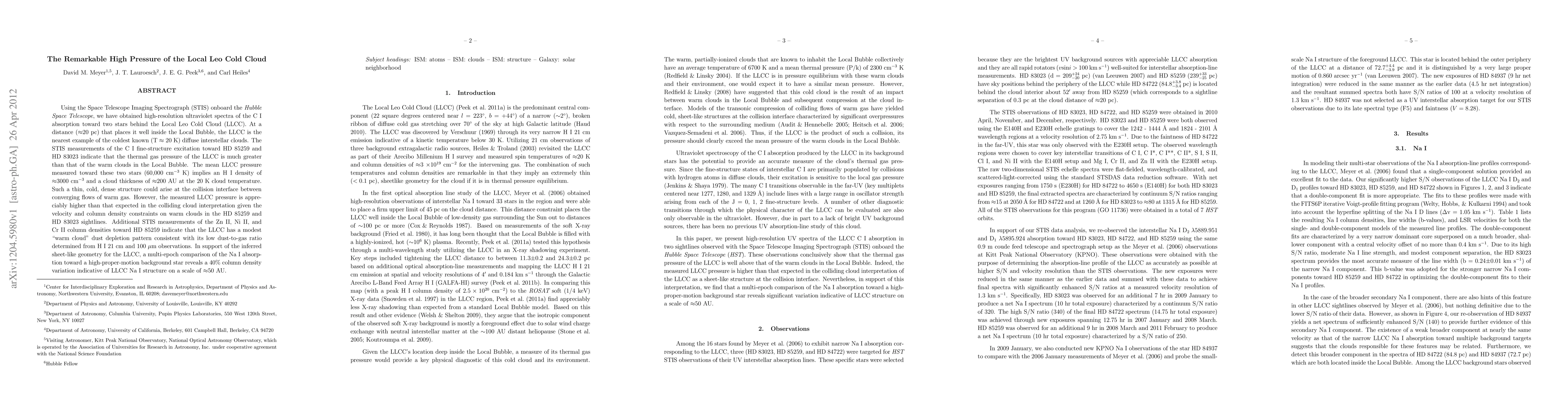 Using the Space Telescope Imaging Spectrograph (STIS) onboard the Hubble Space Telescope, we have obtained high-resolution ultraviolet spectra of the C I absorption toward two stars behind the Local Leo Cold Cloud (LLCC). At a distance (~20 pc) that places it well inside the Local Bubble, the LLCC is the nearest example of the coldest known (T~20 K) diffuse interstellar clouds. The STIS measurements of the C I fine-structure excitation toward HD 85259 and HD 83023 indicate that the thermal gas pressure of the LLCC is much greater than that of the warm clouds in the Local Bubble. The mean LLCC pressure measured toward these two stars (60,000 cm$^{-3}$ K) implies an H I density of ~3000 cm$^{-3}$ and a cloud thickness of ~200 AU at the 20 K cloud temperature. Such a thin, cold, dense structure could arise at the collision interface between converging flows of warm gas. However, the measured LLCC pressure is appreciably higher than that expected in the colliding cloud interpretation given the velocity and column density constraints on warm clouds in the HD 85259 and HD 83023 sightlines. Additional STIS measurements of the Zn II, Ni II, and Cr II column densities toward HD 85259 indicate that the LLCC has a modest "warm cloud" dust depletion pattern consistent with its low dust-to-gas ratio determined from H I 21 cm and 100 micron observations. In support of the inferred sheet-like geometry for the LLCC, a multi-epoch comparison of the Na I absorption toward a high-proper-motion background star reveals a 40% column density variation indicative of LLCC Na I structure on a scale of ~50 AU.