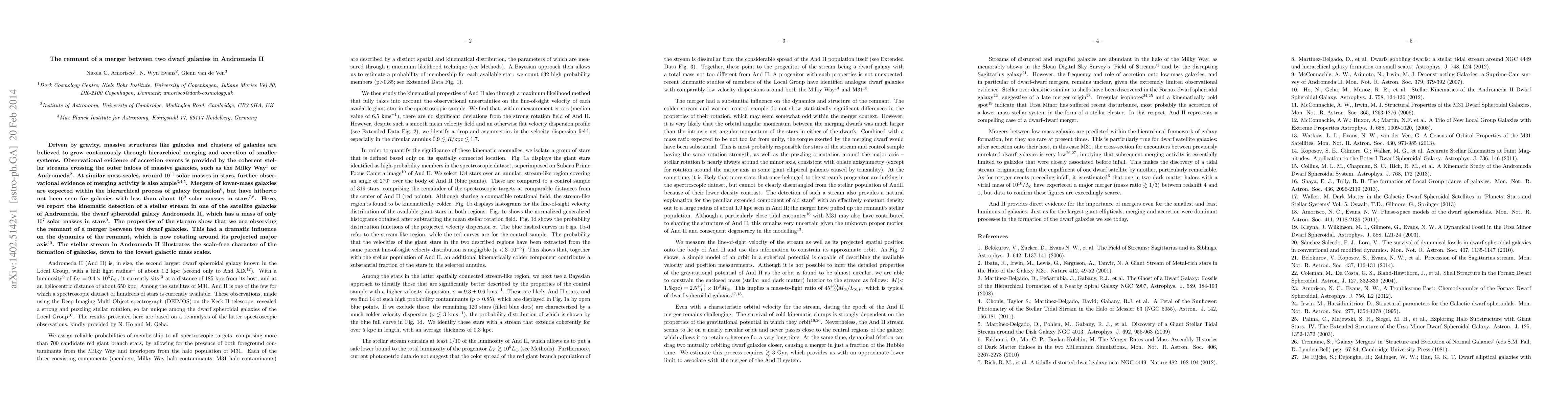 This paper reports the detection of a stellar stream in Andromeda II, a dwarf galaxy, revealing the remnant of a merger between two dwarf galaxies, demonstrating the hierarchical merging process down to very low galactic mass scales. The merger dramatically altered the dynamics of Andromeda II, which now rotates around its major axis.