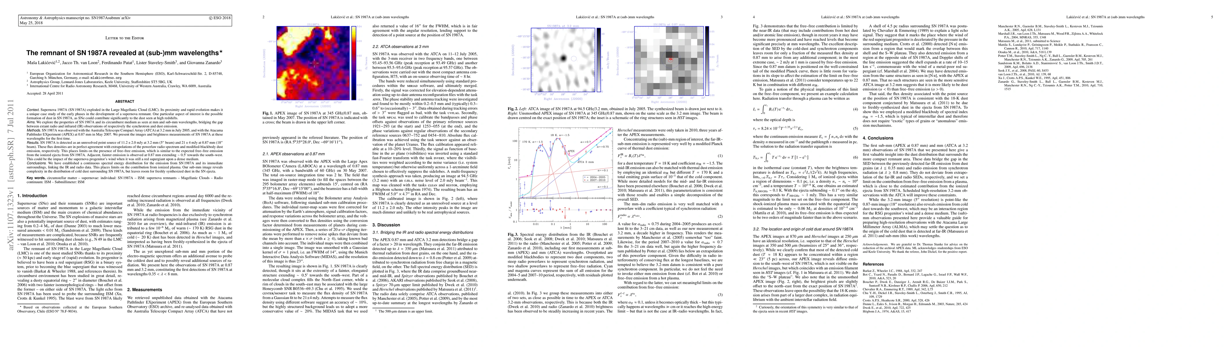 This study reveals the remnant of SN1987A at (sub-)mm wavelengths using ATCA and APEX, detecting it as an unresolved point source and finding fainter emission possibly linked to the progenitor's wind. The results establish a continuous spectral energy distribution, limiting ionized plasma contribution and suggesting complex cold dust distribution.