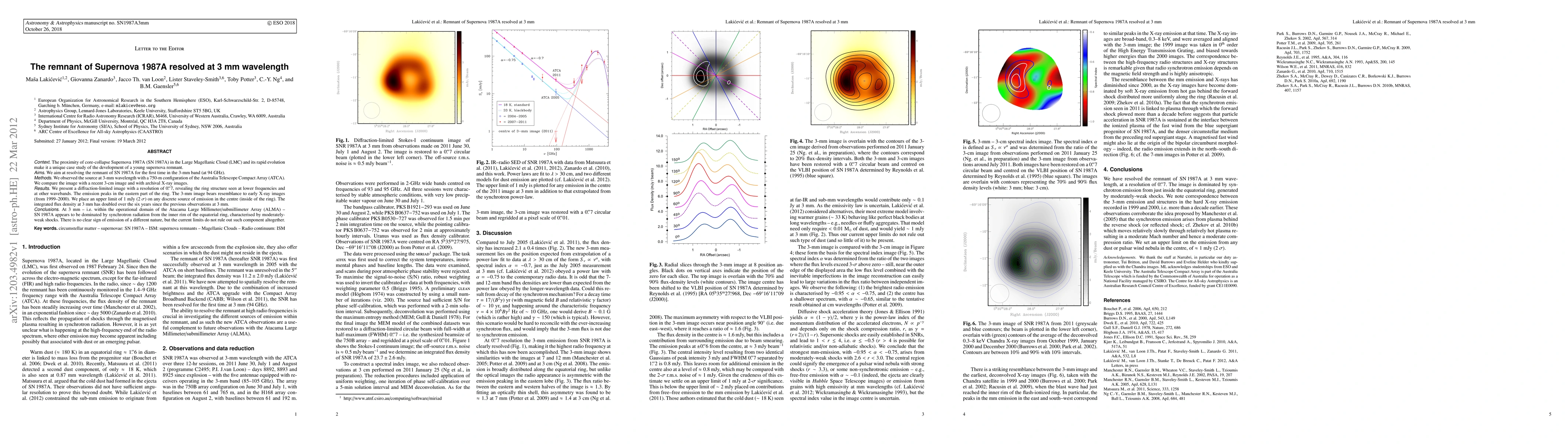 This study uses the Australia Telescope Compact Array to resolve the remnant of Supernova 1987A at 3 mm wavelength, revealing a ring structure with synchrotron radiation from the inner rim. The integrated flux density at 3 mm has doubled in six years, indicating moderately-weak shocks, while no discrete source of emission is detected in the center.