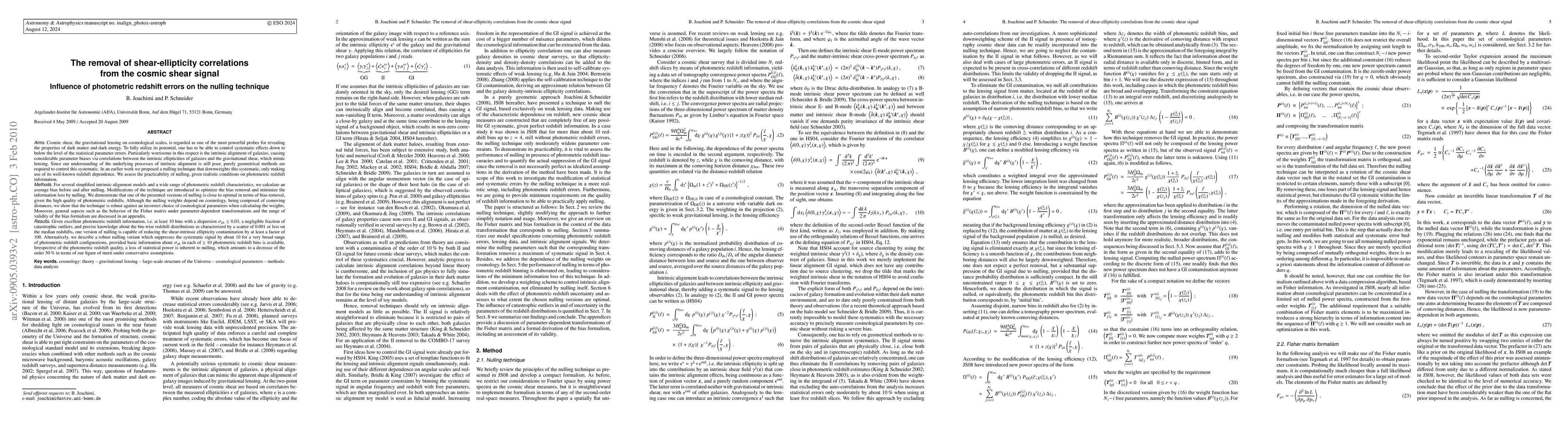 This paper investigates the effectiveness of a nulling technique to mitigate shear-ellipticity correlations in cosmic shear measurements, focusing on the influence of photometric redshift errors. It demonstrates that high-quality photometric redshifts can significantly reduce systematic biases, though nulling inherently reduces statistical power by about 50%.