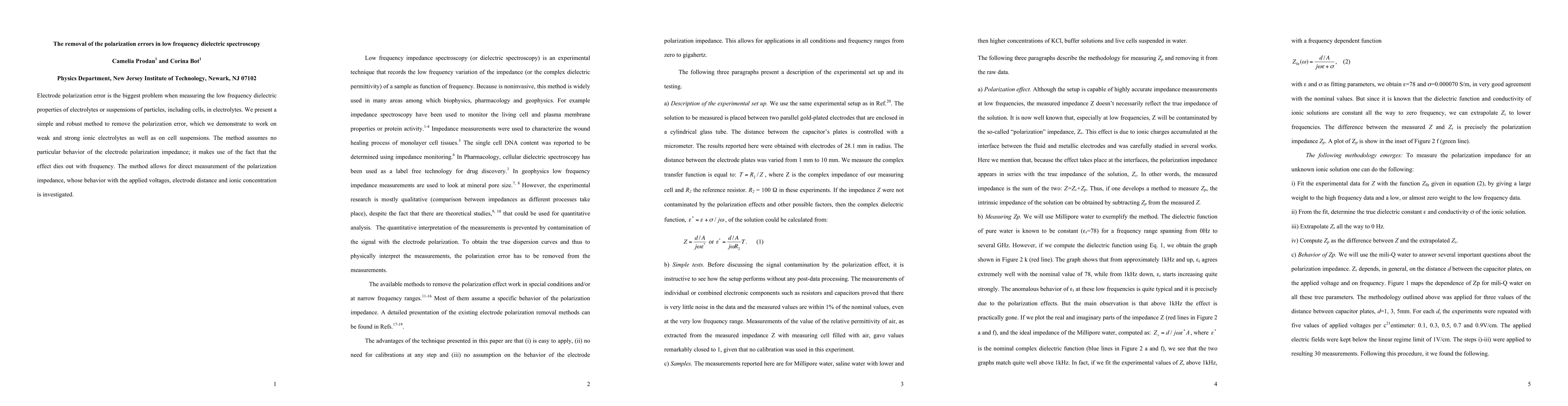 This paper presents a method to eliminate electrode polarization errors in low-frequency dielectric spectroscopy, applicable to electrolytes and cell suspensions. The method leverages the frequency-dependent decay of polarization effects, enabling direct measurement of polarization impedance.