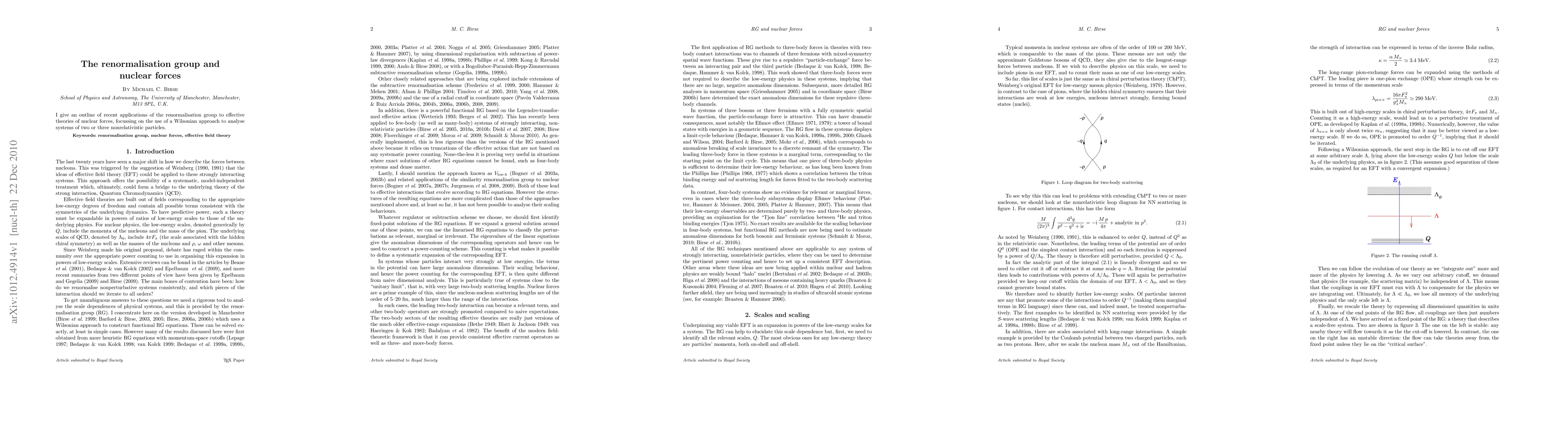 I give an outline of recent applications of the renormalisation group to effective theories of nuclear forces, focussing on the use of a Wilsonian approach to analyse systems of two or three nonrelativistic particles.